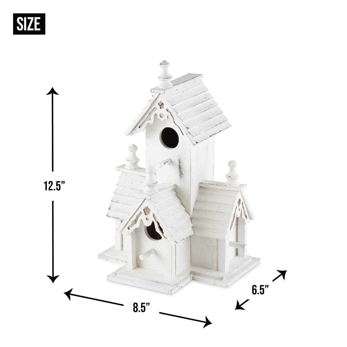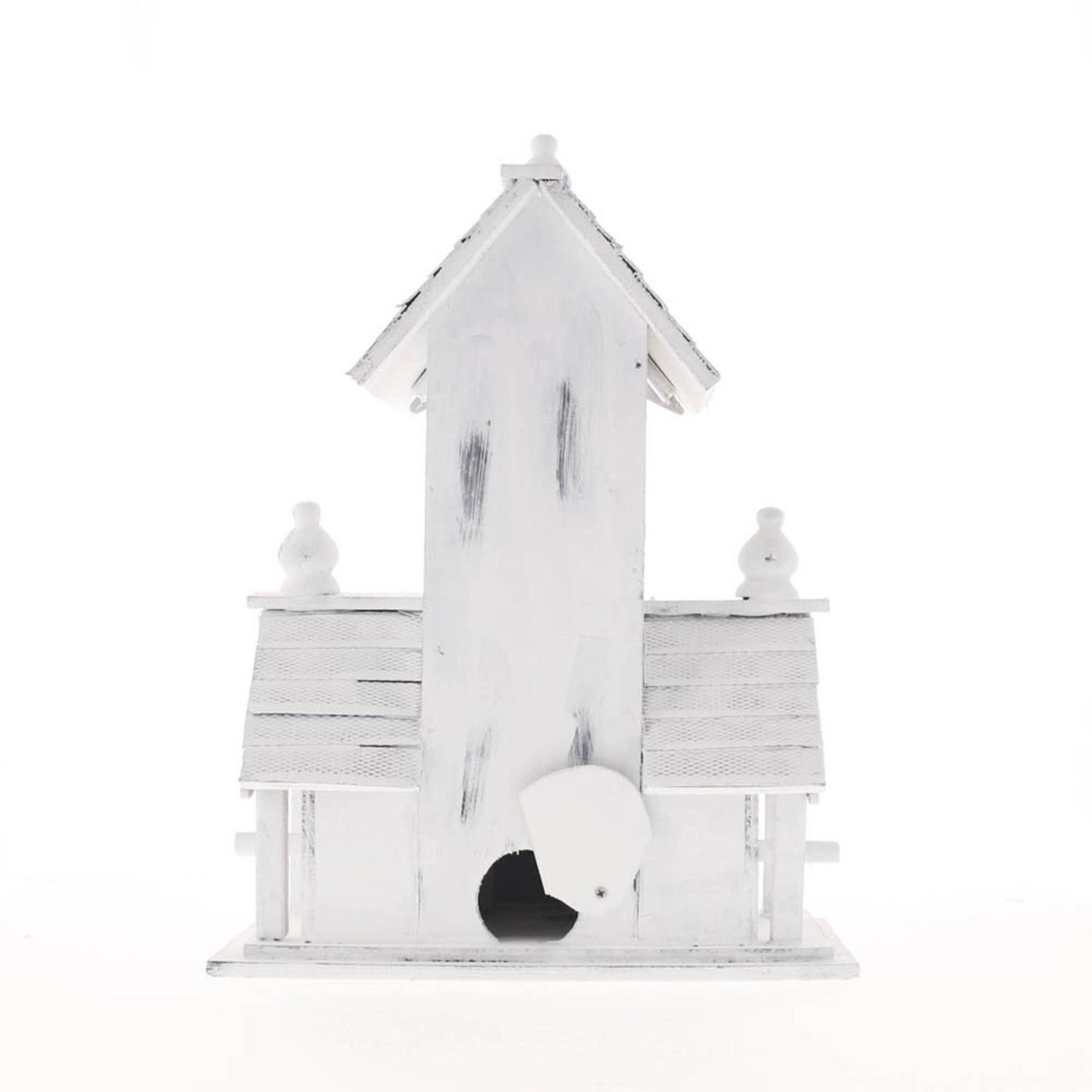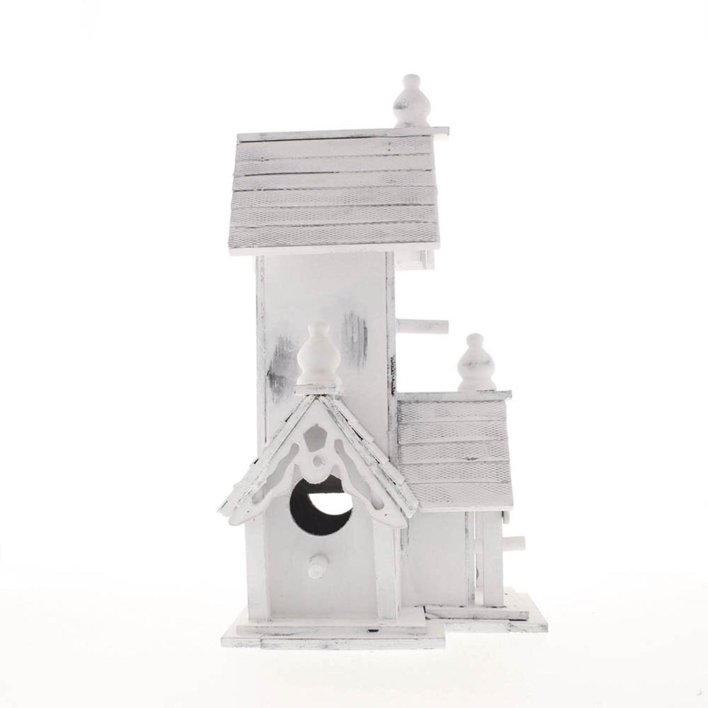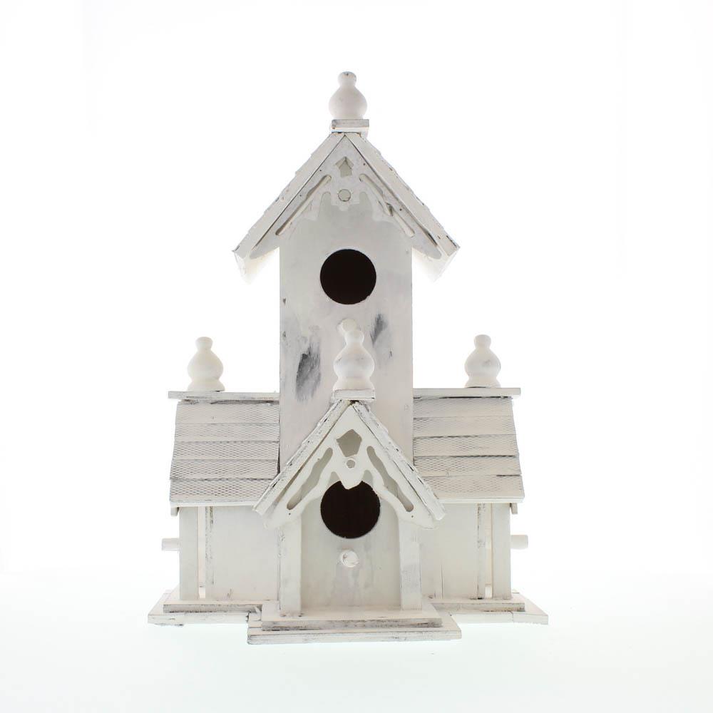 • Victorian-style birdhouse features distressed white-finished wood, multiple entrances, and detailed wood trim with an heirloom look.
