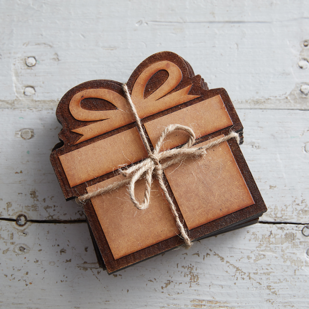 These Christmas Present Coasters are a gift all on their own. They provide an eccentric and fun way to protect a table. These coasters are fashioned from MDF with burned detailing and come packaged together with jute in a bow. Each coaster measures 4½''W x ¼''D x 4½''H.