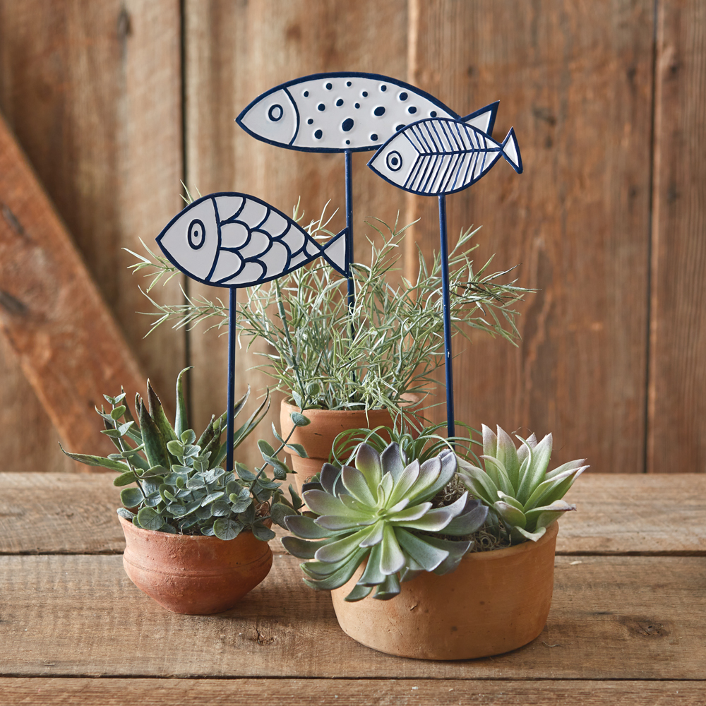 Decorate your garden pots with a touch from the sea simply by placing these fish picks inside. Each can be placed in a garden as well. Medium stake measures 4''W x 12½''H and smallest stake measures 5''W x 10½''H.