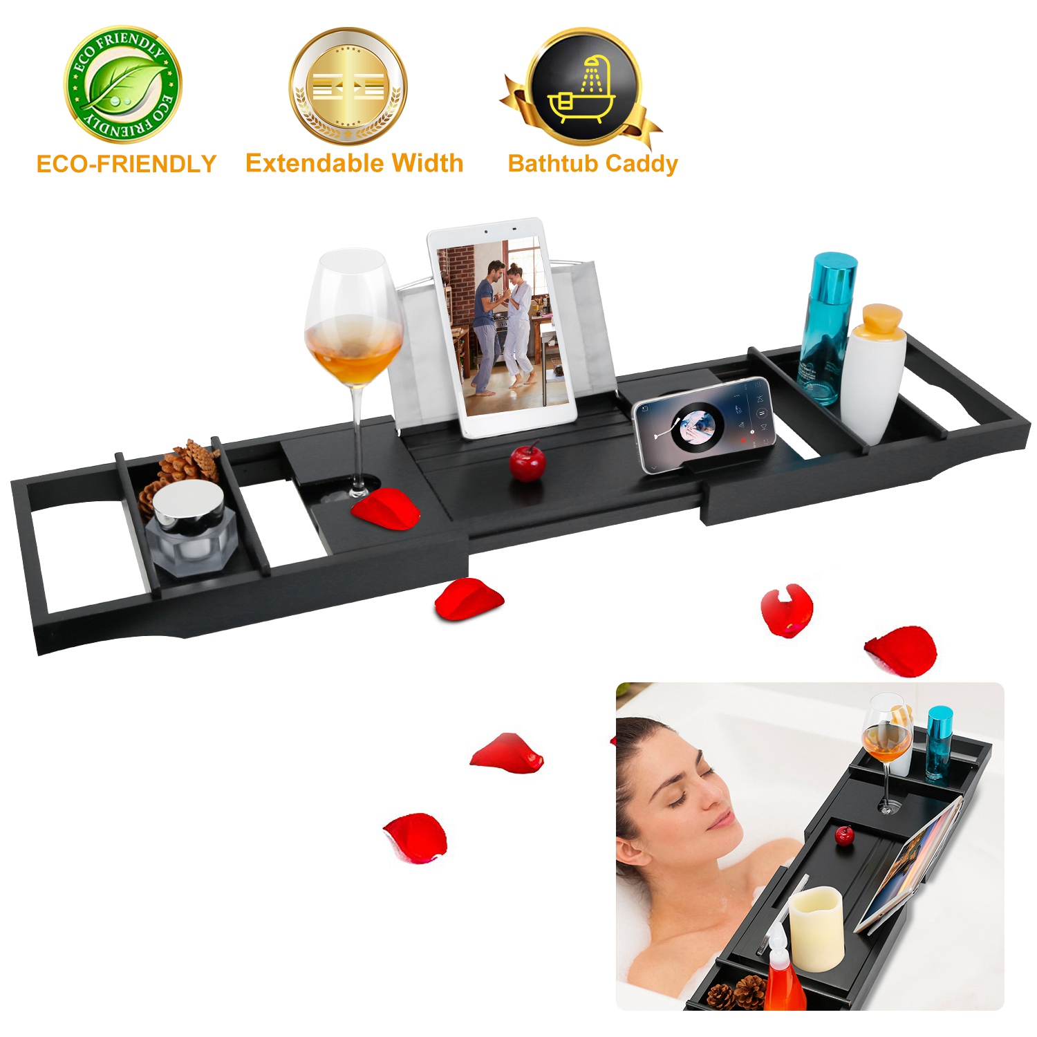 Home > Bathtub Caddy Tray Crafted Bamboo Bath Tray Table Extendable Reading Rack Tablet Phone Holder Wine Glass Holder Shelf Desk Bathroom Spa