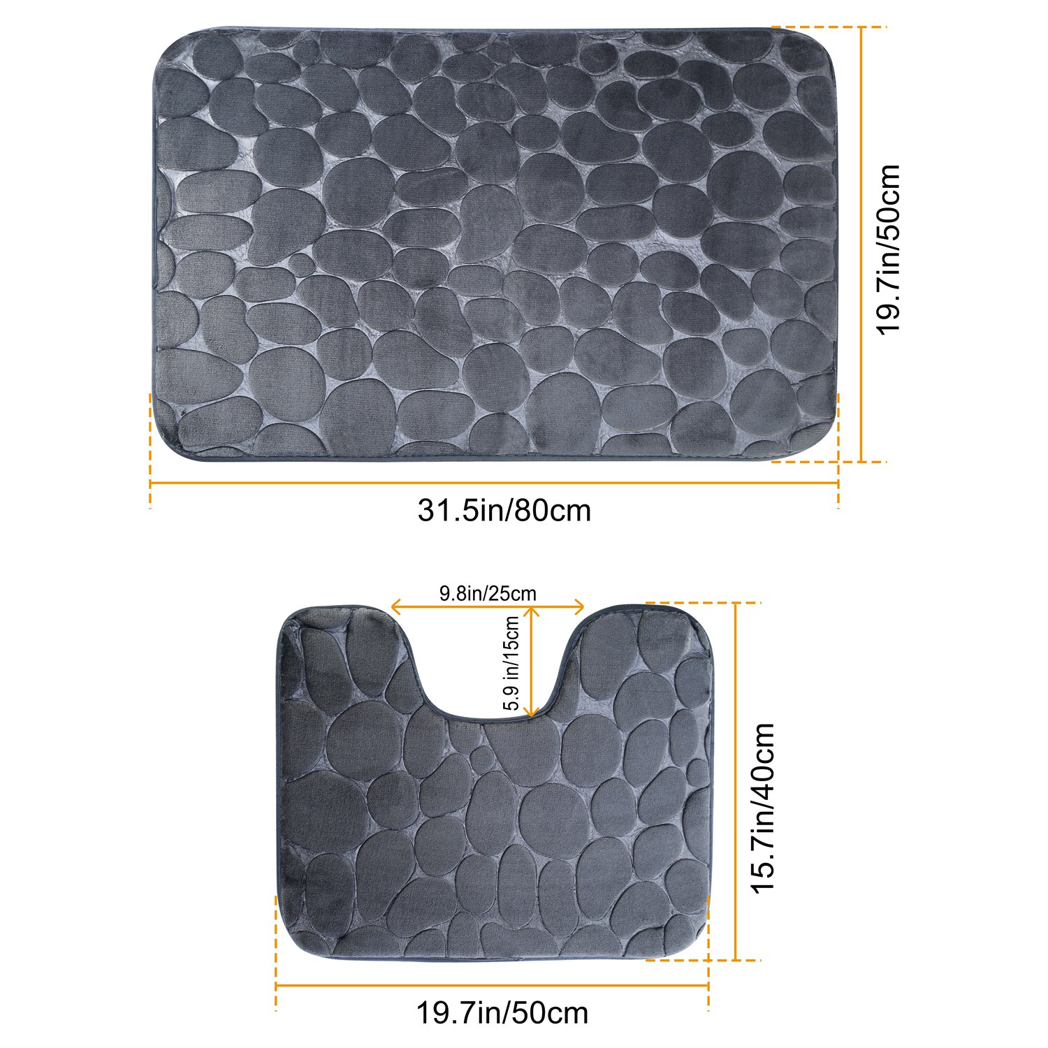 Are you looking for a set of non-slip bathroom rugs for your bathroom?Our 2 pcs/set flannel non-slip mat set including a square floor mat and a U-shaped toilet rug are made of high-grade flannel, thick and soft foam and PVC polyester, which are BPA-free, anti-bacterial and skin-friendly, perfect for bathroom use. The PVC net in the bottom can keep the bath mat staying in place, preventing slipping or sliding to provide more security to you and your family. The pebbles-shaped patterns are cute and can give a natural massage function to our feet to accelerate blood circulation and relief fatigue. The mat also features with great absorbent function, which can soak up the water like sponge and keep your floor dry quickly, keeping away from any mildew or moldy. The mats are easy to clean, you can machine-wash them without worrying shrink, deform or color-fade.