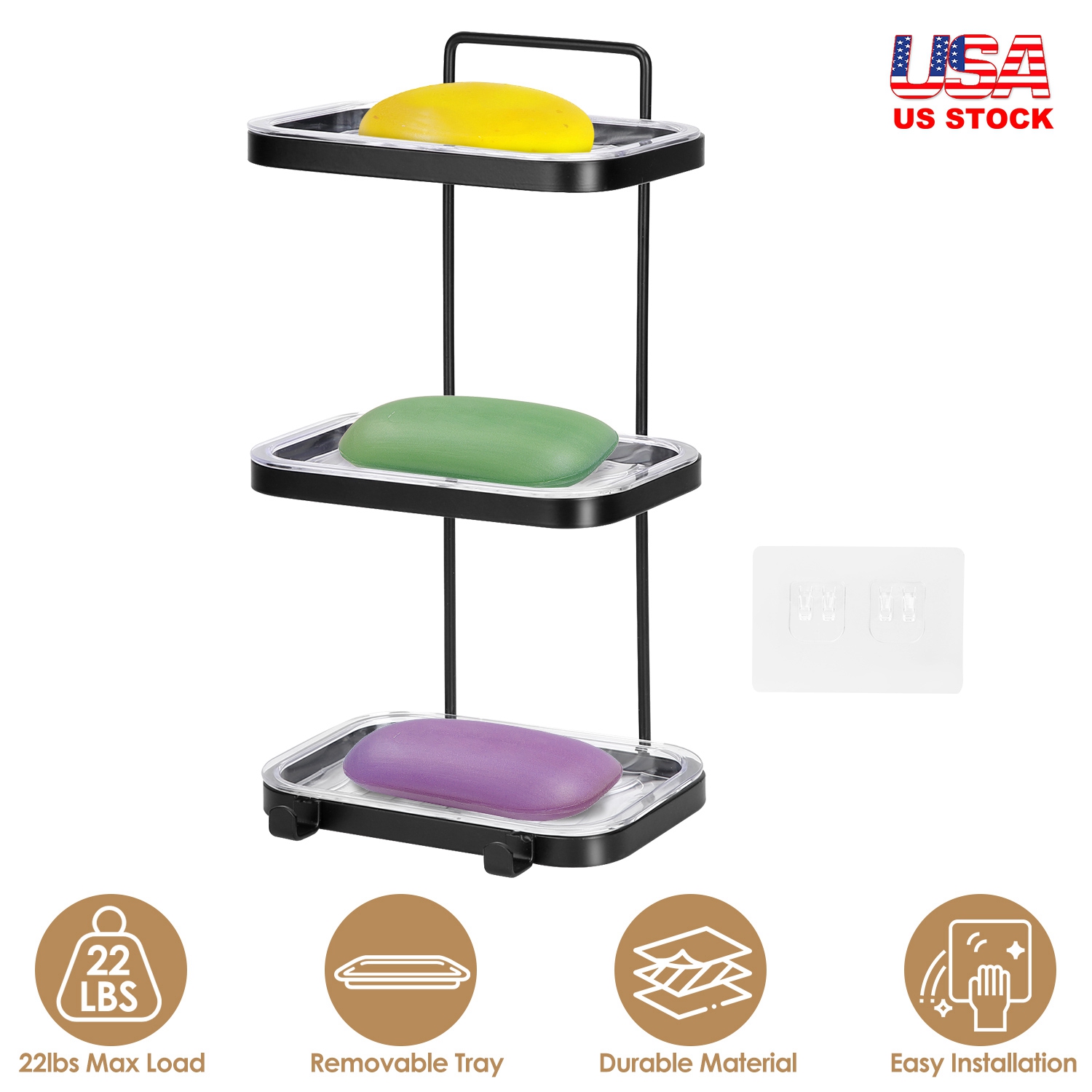 Our soap tray rack is a good choice for your bathroom to store your soap. Iron rack and ABS trays combination design is great for convenient using. Durable iron rack with black painting and strong sticker make it able to hold up to 22lbs. The clear tray can be removed for easy pouring water and cleaning. Solid base is also convenient for you to place your earrings, bracelets, keys and other small items. Also equipped with 2 hooks to hang your bath balls, bath brushes, razors, towel, etc.. Great for bathroom use.