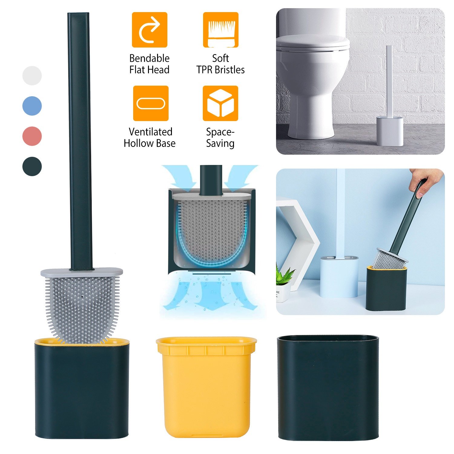Designed with bendable flat TPR head, our toilet brush can reach the rim perfectly to better clean all corners of the toilet bowl without damage on the surface of the glass and porcelain glaze. A vent at the bottom makes it quick to dry and maintain hygiene more effectively. You choose wall mounting or standing holder for space saving with two included stickers. Suitable for toilets, sinks, bathtubs, etc..
