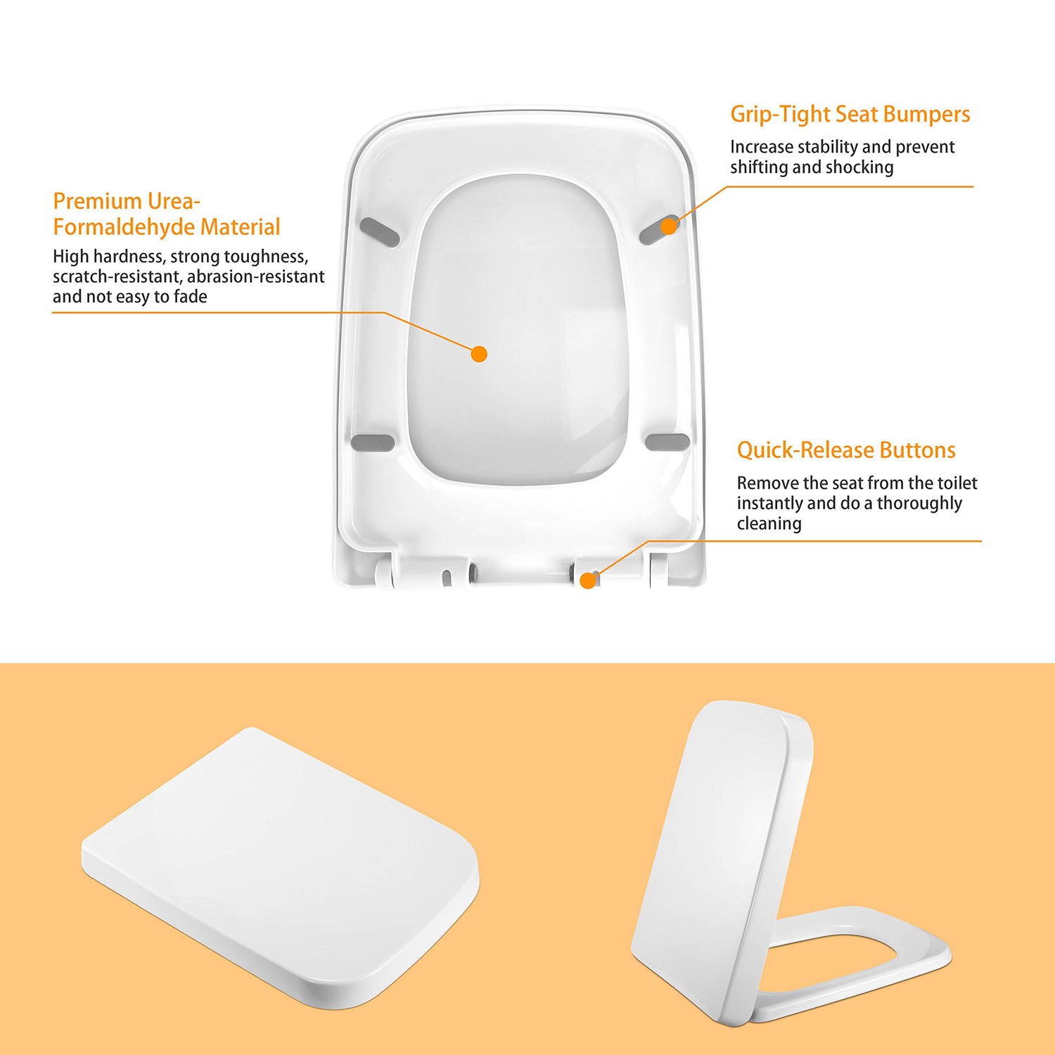 Our square-shaped toilet seat (7.72in-L x 13.78in-W x 1.77in-H) is made from premium urea-formaldehyde materials, high hardness, strong toughness, scratch-resistant, abrasion-resistant and not easy to fade. Adopting slow-close design, it can be closed slowly to avoid loud slam, cracked toilets and pinched fingers. Additionally, it can be installed easily and securely with a set of quick-attach mounting accessories and removed instantly for a thorough cleaning with its designed quick-release buttons.