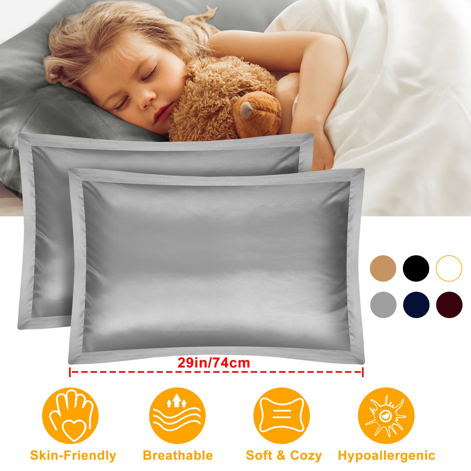 Our silky satin pillowcase comes with 2 packs and 6 colors for you option to match your bedding, including: Navy, Burgundy, Ivory, White, Silver and Black. Made with premium silk-like polyester fabrics that is for optimal softness to embrace a comfortable restful night’s sleep. Soft and smooth feeling, our pillowcase is helpful to reduce facial wrinkles compared to other coarse pillowcase; Also it can keep your hair safe from harm and knotted. Moreover, they’re skin-friendly and moisture to help feel cool in summer and warm in winter. Make you enjoy a sound sleep and have healthy skin and beautiful hair every morning.