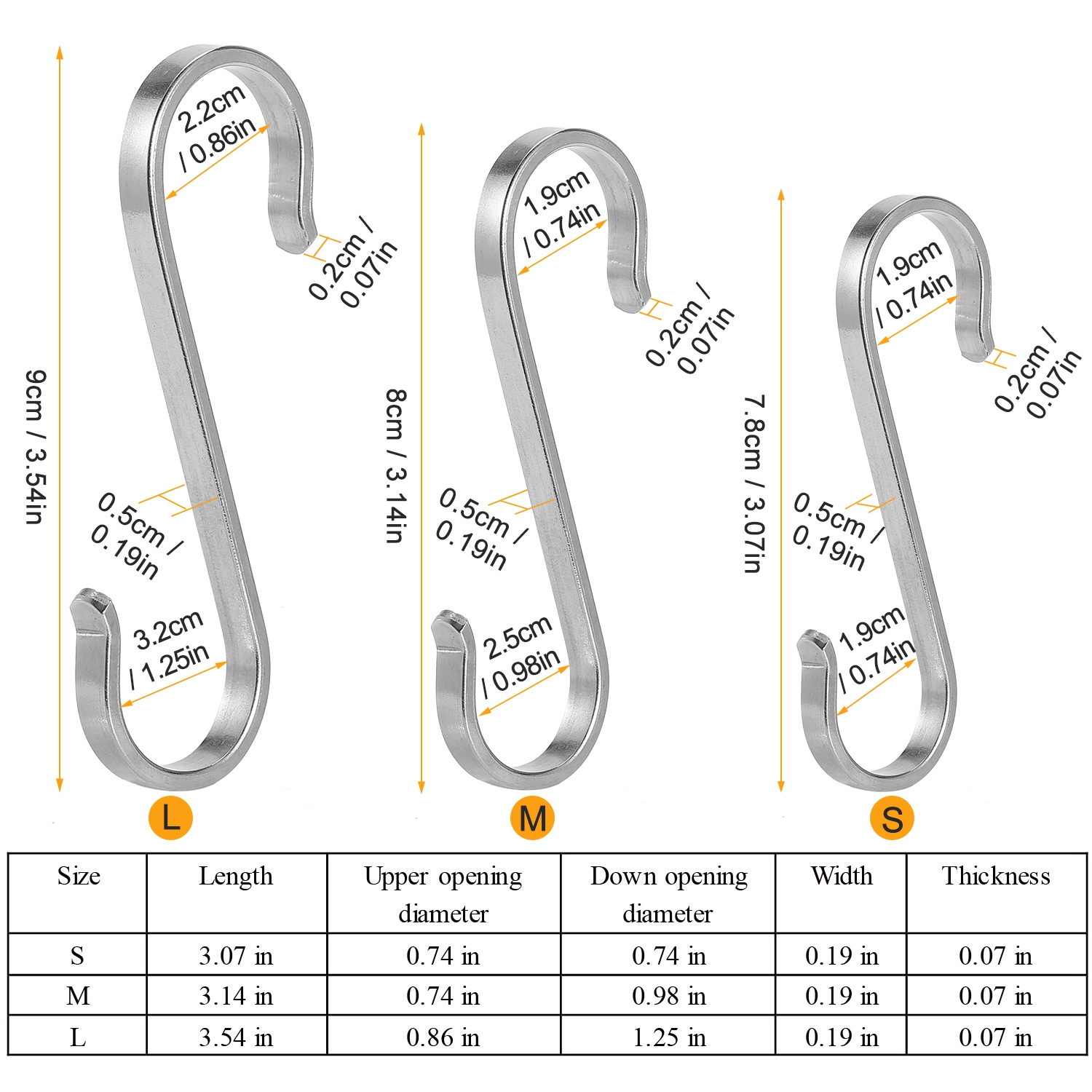 Our 5 pcs flat S-Shaped stainless steel hooks have three sizes: S, M and L for your selection, you can make your choice according to your needs. Our hooks are made of premium-quality stainless steel, abrasion-resistant, rustproof and durable, and can be used to hang heavy stuff (up to 22lb) without deformation. These hooks are perfect for organizing your kitchen by hanging pans, pots and spoons on the wall, saving more space for the kitchen, and also suitable for closet, tool room, bathroom, garage and garden, hanging clothes, tools, shower curtains, lamps and garden decorations. The special design in the end can resist falling and slipping, bringing more convenience to use.