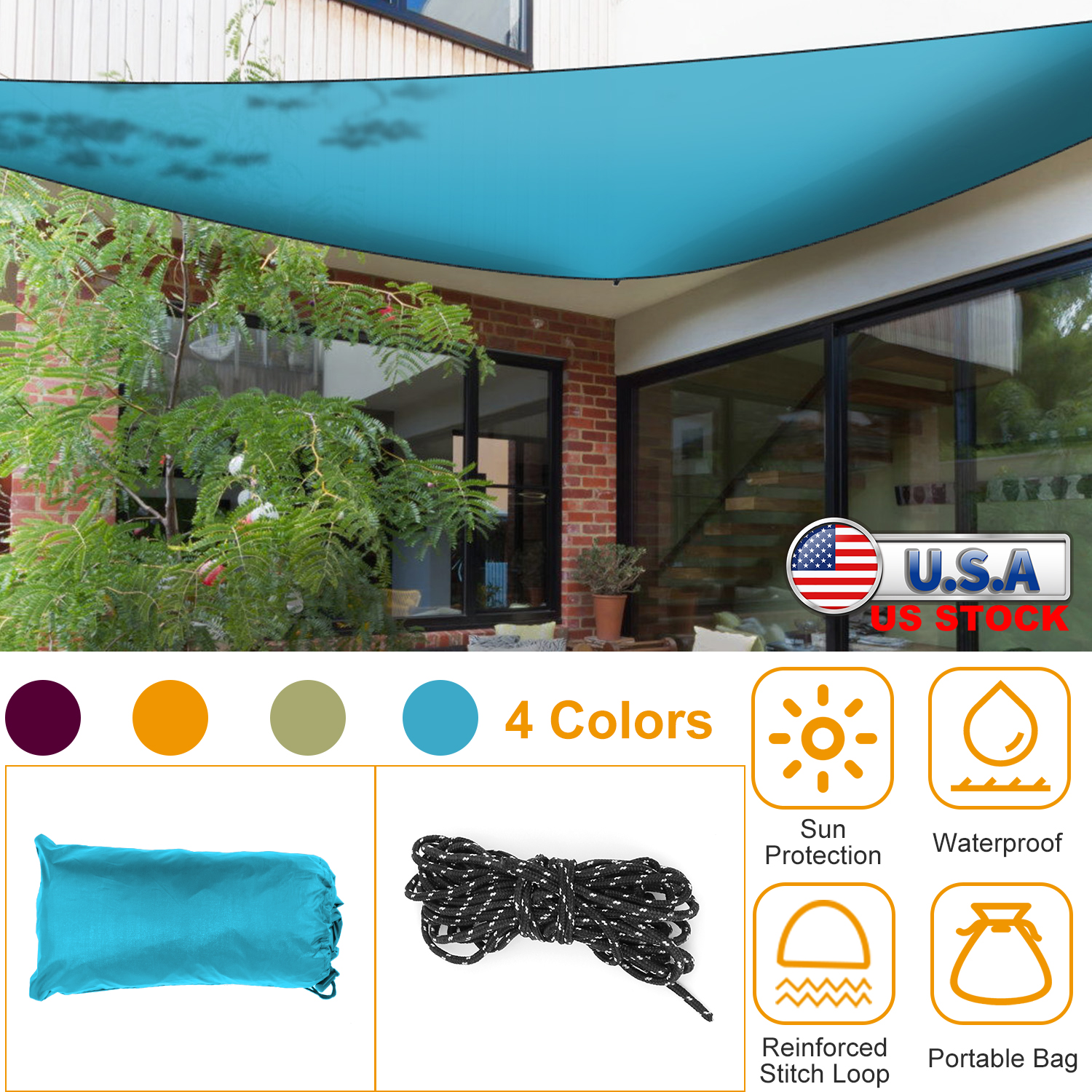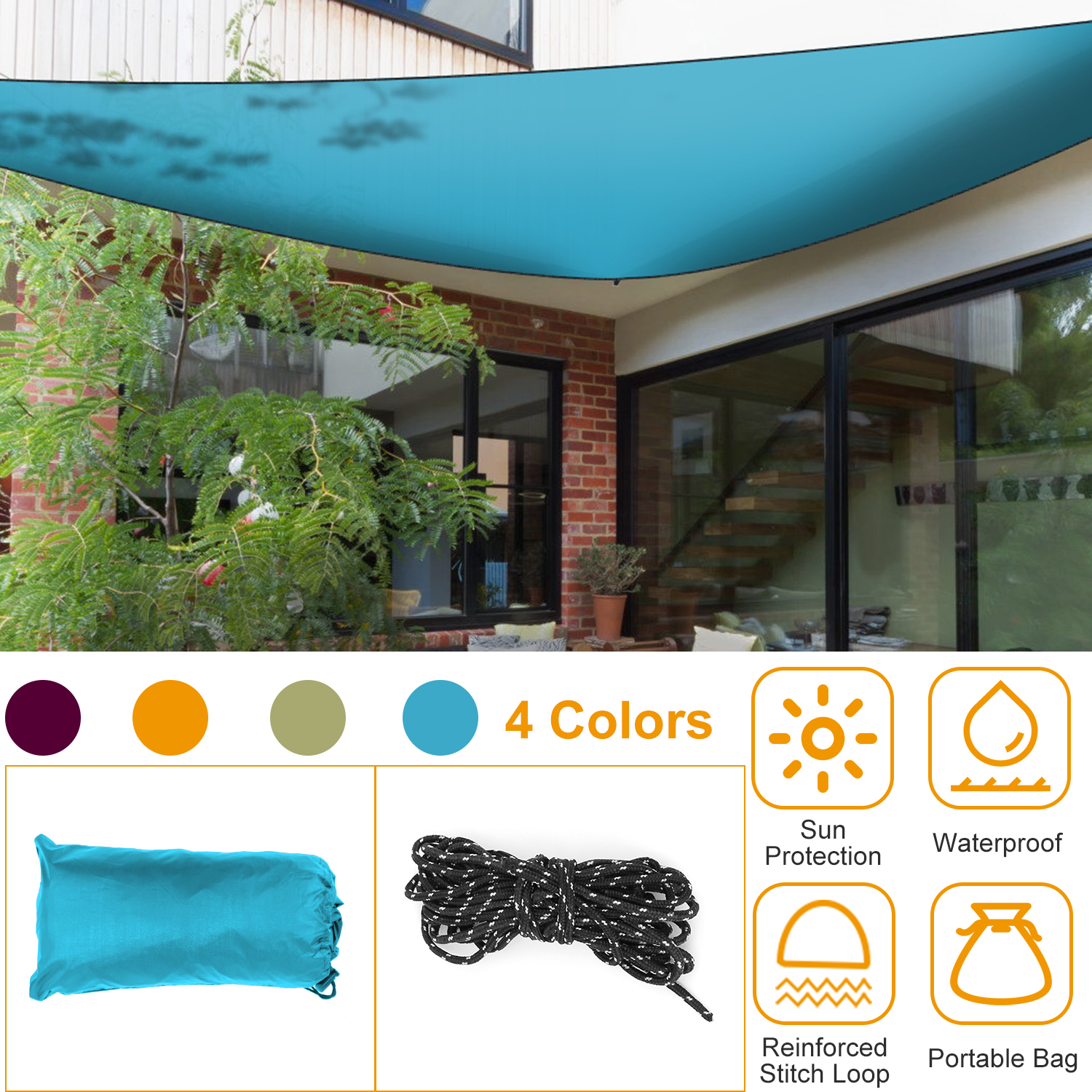 Our Shade Sail Top Canopy, made of polyester taffeta material, is waterproof and can block the sun for you, which is durable enough to last a long time. All durable edges, which are reinforced, can properly tension. Pull the rope tighter, keep knots stay tight without any slipping. You can use it in the patio, lawn, garden and so on in the sun or in light rain. But do not use it in heavy rain.