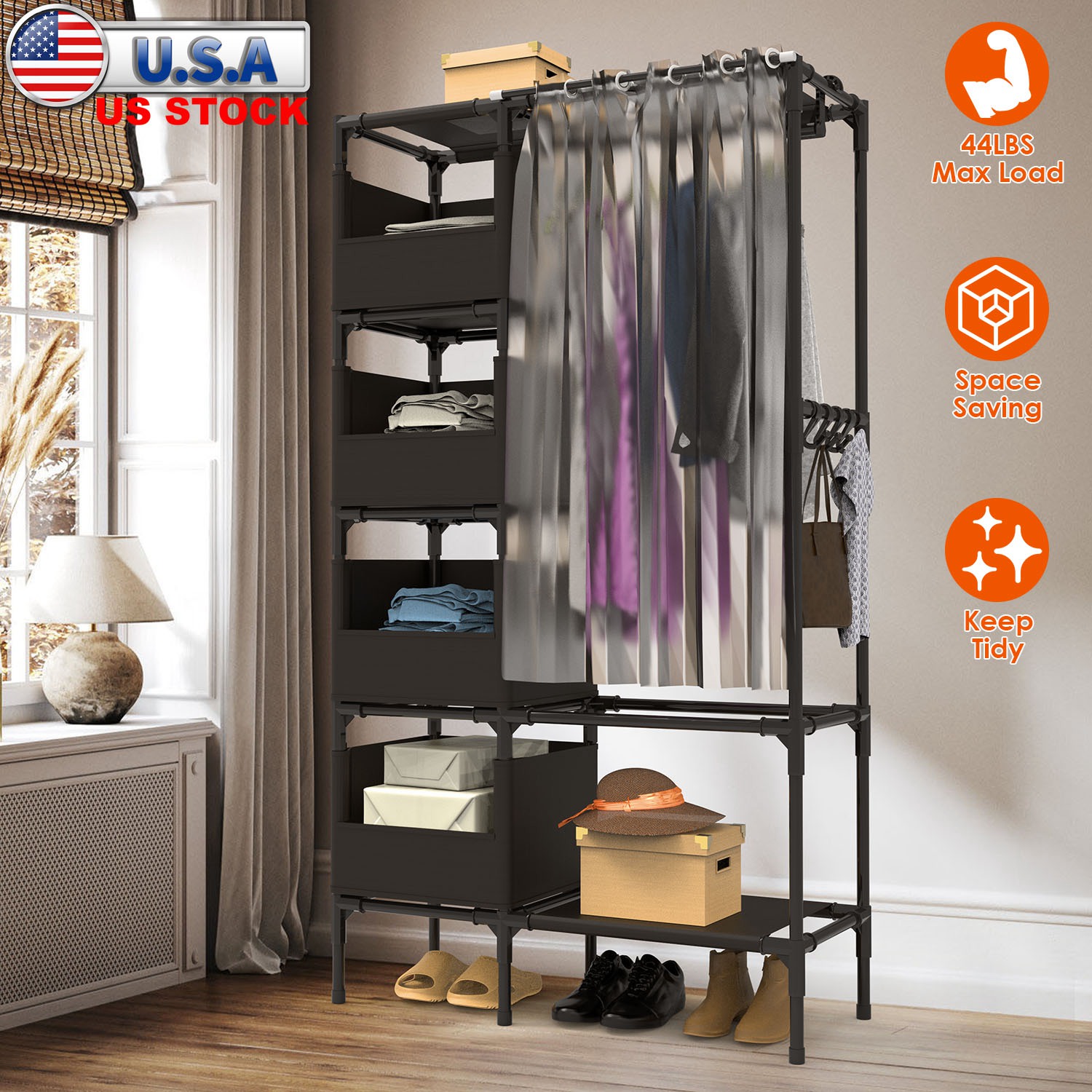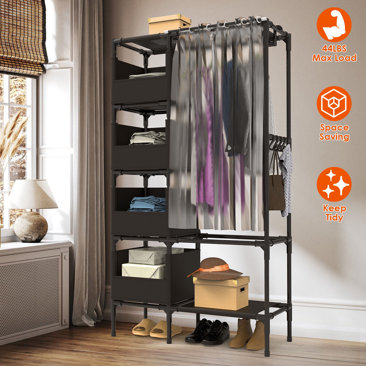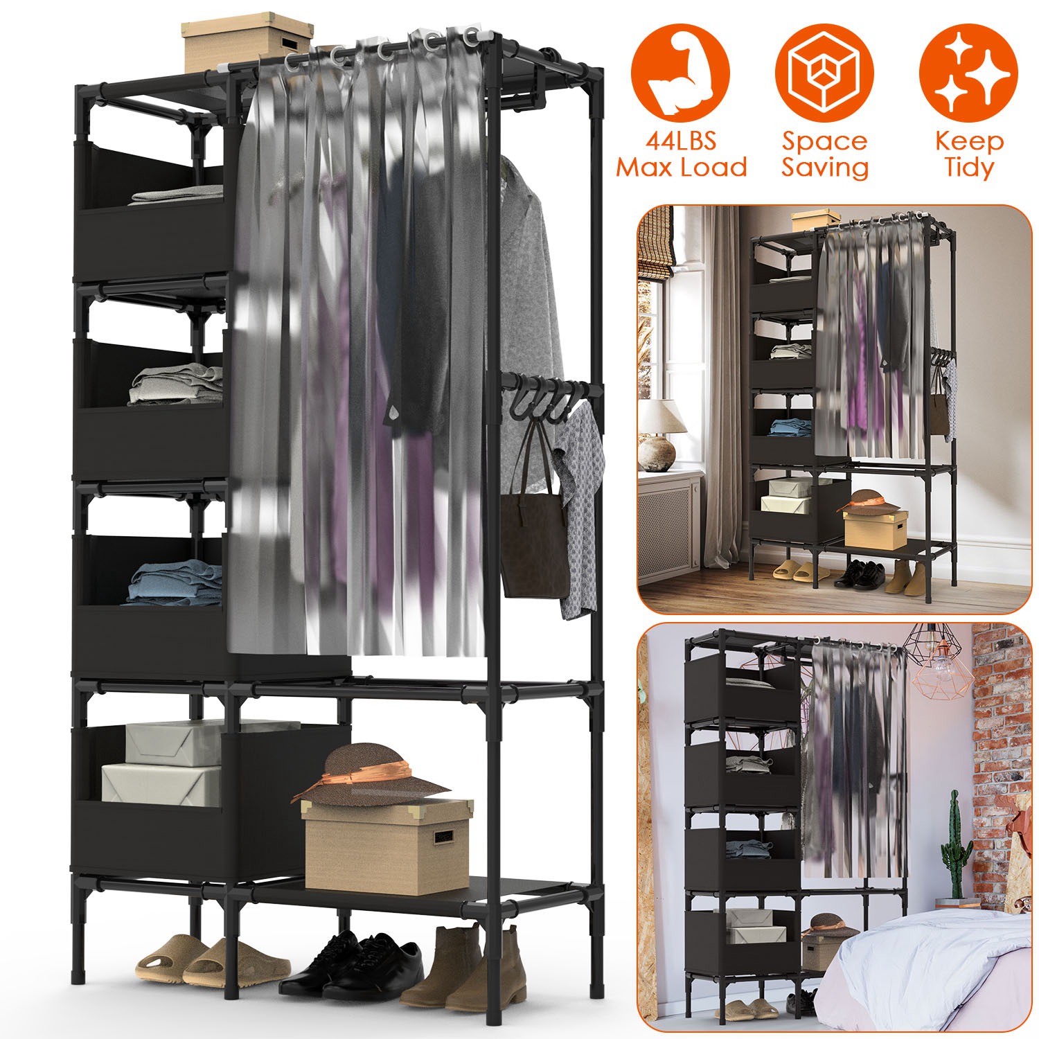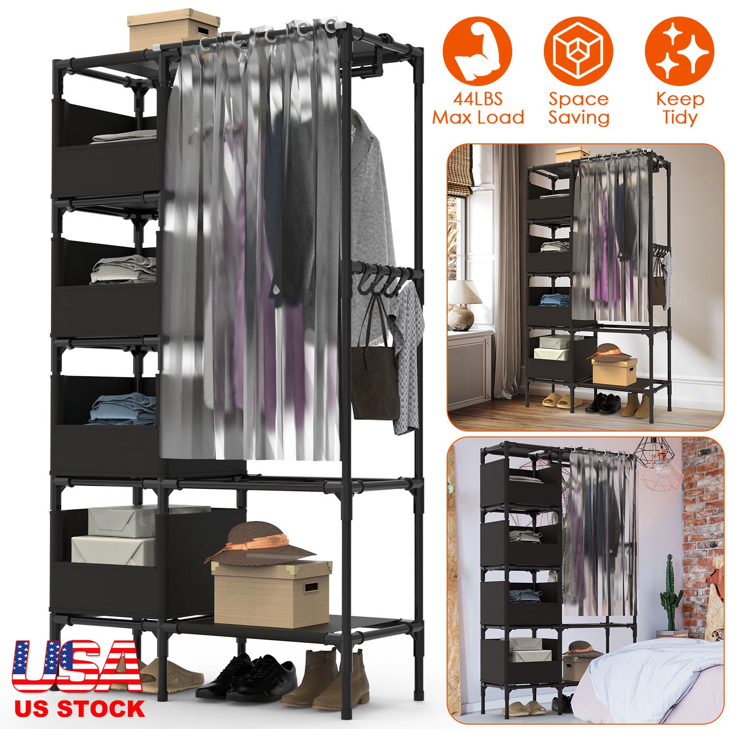 Are you bothered and need a simple closet wardrobe to tidy up your clothes quickly It is optimal for laundry room, bedroom, and other small room. Designed with 4 storage bag compartments that are great for your bags, plush toys, 1 bottom shelf for your daily shoes, 1 hanger rod for your coats, dresses, and 4 hooks for your ties, shawls, caps and more. A must-have to keep your room neat and orderly. Non-woven fabric and curtain design are great to prevent dust and add much elegance to your room. Durable steel tube and plastic connector make it able to hold up to lbs. Easy to install with your bare hand, other tools needed.