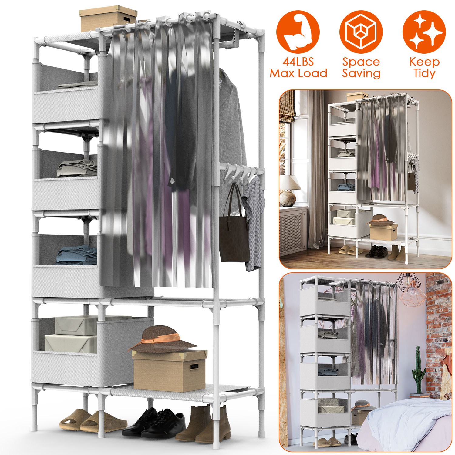 Are you bothered and need a simple closet wardrobe to tidy up your clothes quickly It is optimal for laundry room, bedroom, and other small room. Designed with 4 storage bag compartments that are great for your bags, plush toys, 1 bottom shelf for your daily shoes, 1 hanger rod for your coats, dresses, and 4 hooks for your ties, shawls, caps and more. A must-have to keep your room neat and orderly. Non-woven fabric and curtain design are great to prevent dust and add much elegance to your room. Durable steel tube and plastic connector make it able to hold up to lbs. Easy to install with your bare hand, other tools needed.