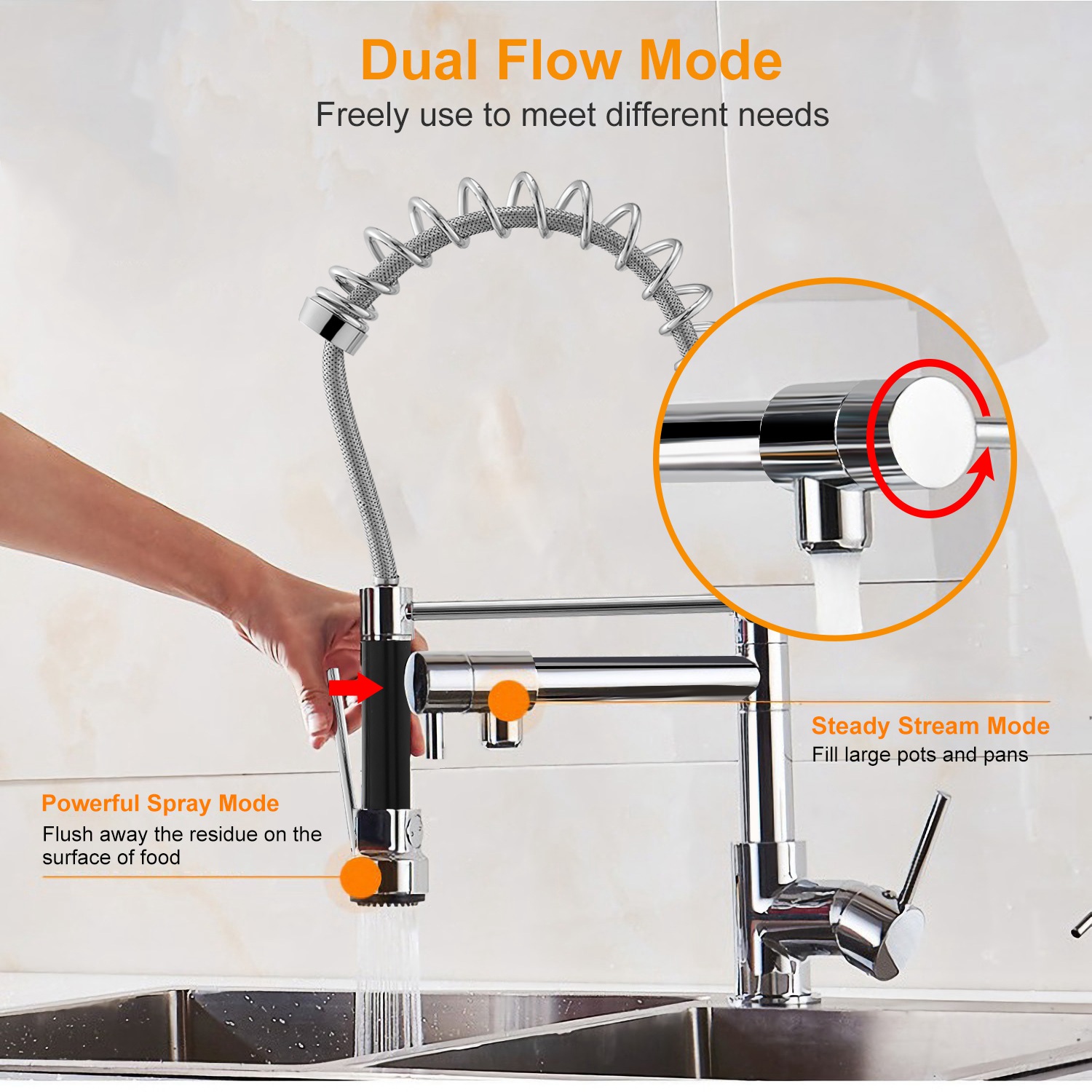 Our kitchen faucet adopts high-grade brass materials and premium chrome plated finish, safe, high-heat temperature, abrasion resistant, anti-corrosion and anti-rust. It comes with two water flow modes (powerful spray mode and steady stream mode) which you can use these two modes simultaneously to meet your different needs. Additionally, you can decrease your time to do a convenient cleaning with its 360°rotatable and flexible head to increase water cover range.