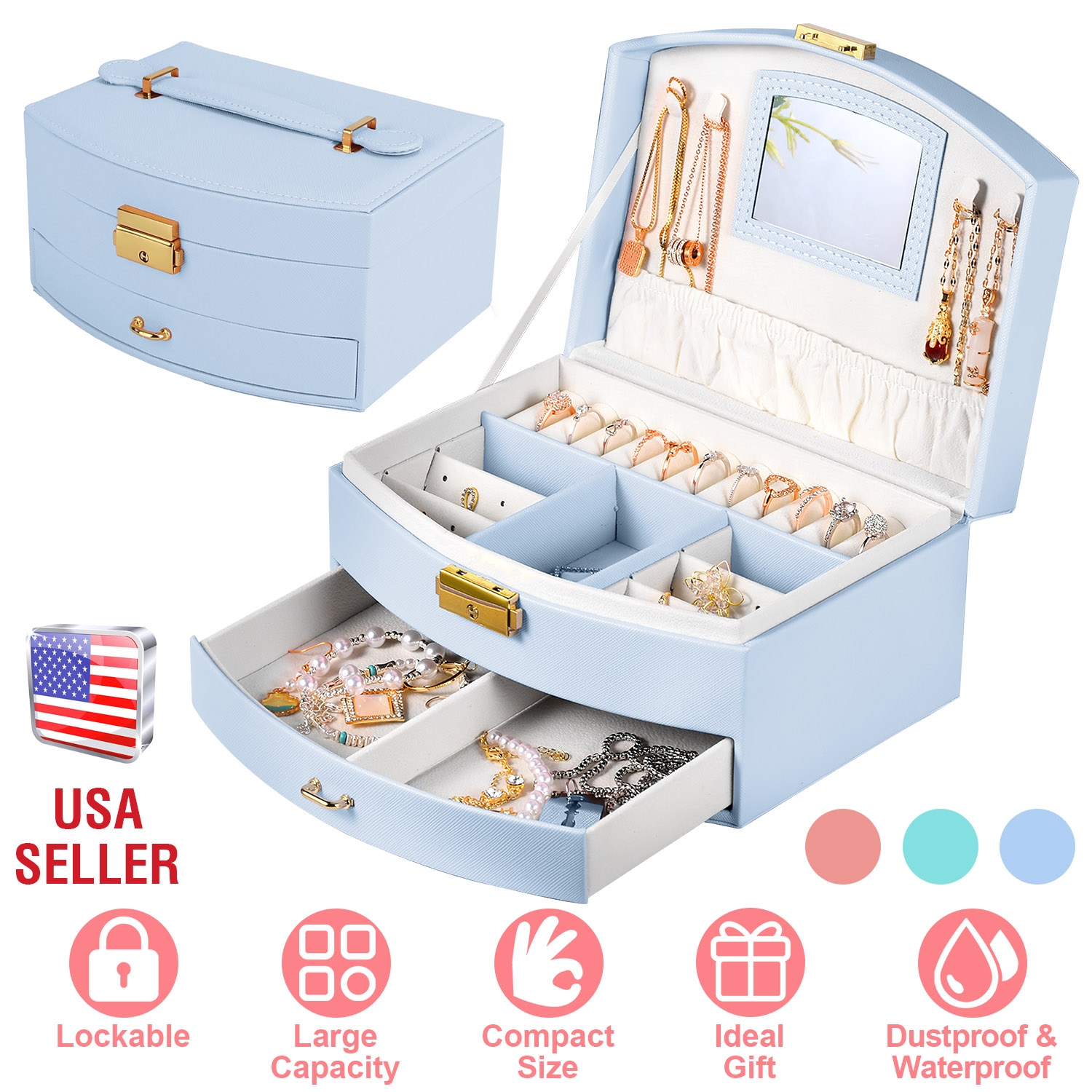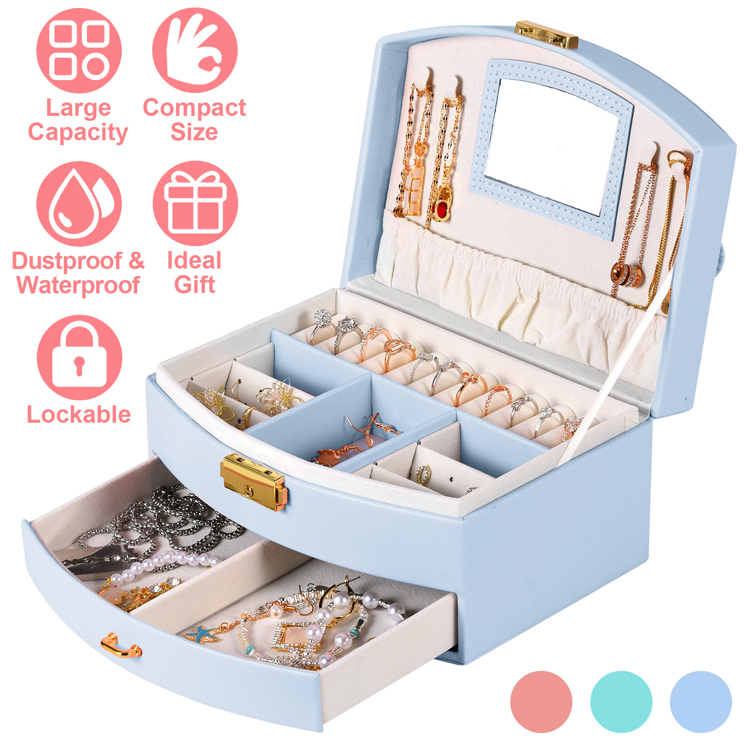 Thrill your girl with our jewelry gift box! Our jewelry box comes with 2 layers, which offer a spacious space for all your precious jewelry pieces or beautiful hair accessories, such as bracelets, watches, brooches, necklaces, hair ties. Rings and more. Crafted from PU leather, lockable, aesthetically pleasing and resistant to water and dust. The compact size and soft handle makes it easy to carry wherever you go. The mirror allows for effortless grooming or checking your appearance. An ideal gift for beautiful jewelry organizer for wives, girlfriends and teen girls on Valentine's Day, Mother's Day, Thanksgiving, Christmas, birthdays etc..