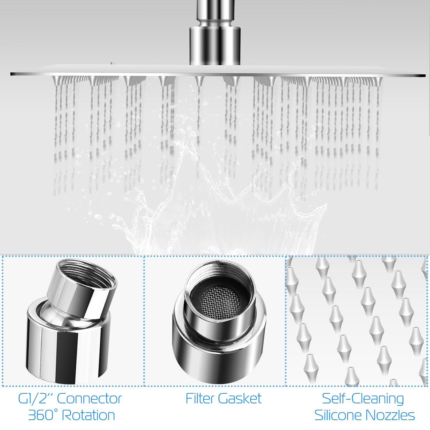 The rain shower head features high-grade mirror stainless steel, silicone rub-clean nozzle and 15° tilt rotatable head to offer you comfortable bath experience. The 0.08in/2mm-thick ultra-thin top shower head offers strong water pressure. Comes with 100pcs self-cleaning silicone nozzles provide clean healthy water flow and a filter gasket included for secondary filtration. Standard G1/2’’ connector fits for universal overhead shower arm with easy installation.