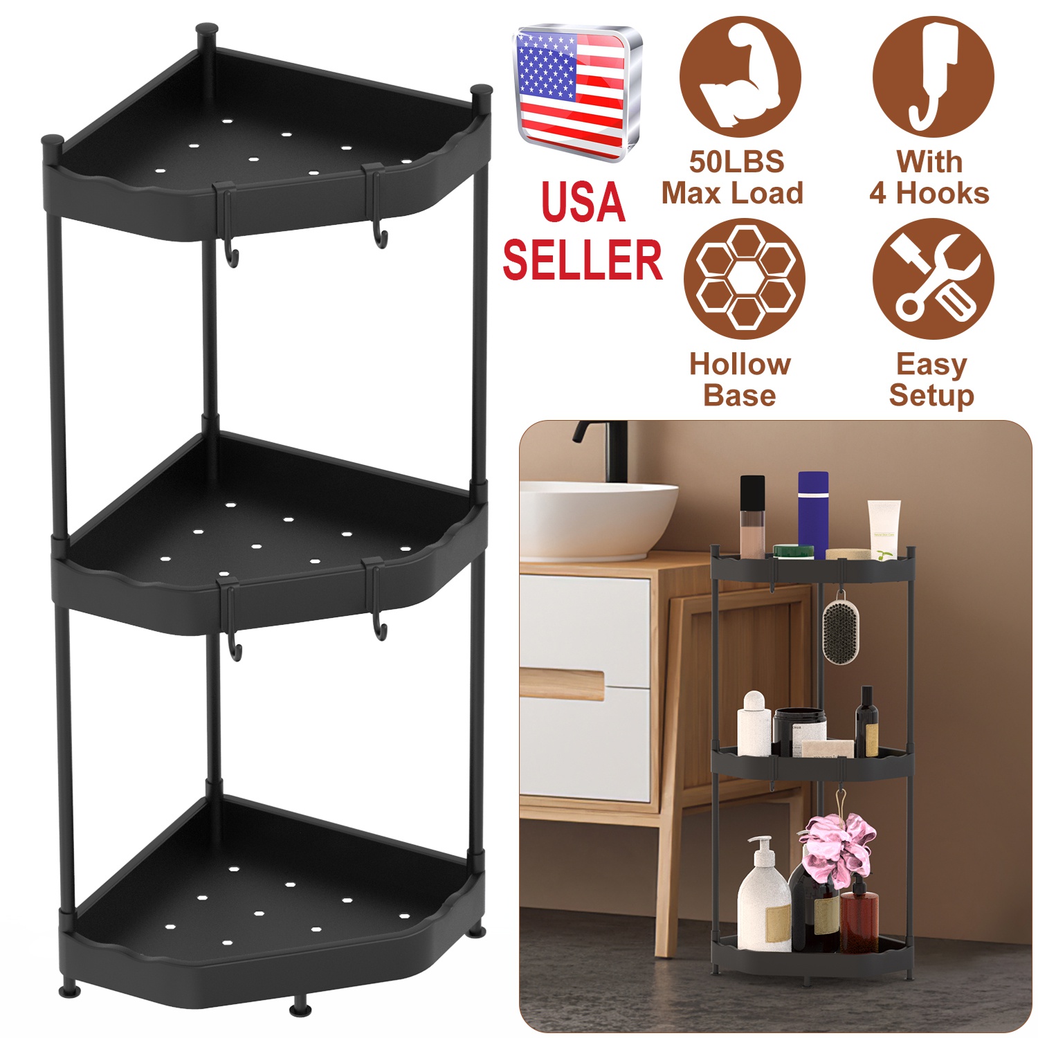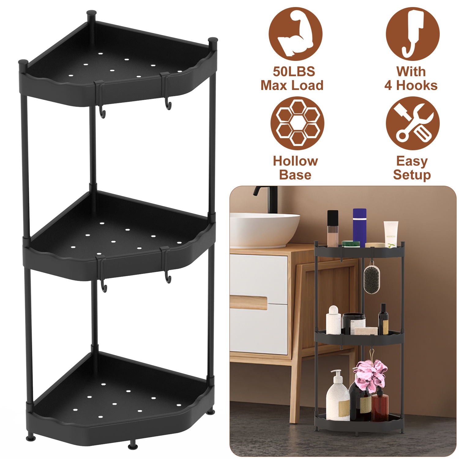 Home > 3 Tier Corner Shower Caddy Floor Standing Corner Shelf Carbon Steel Bathroom Storage Rack Organizer Stand with 4 Hooks for Bathroom Bathtub