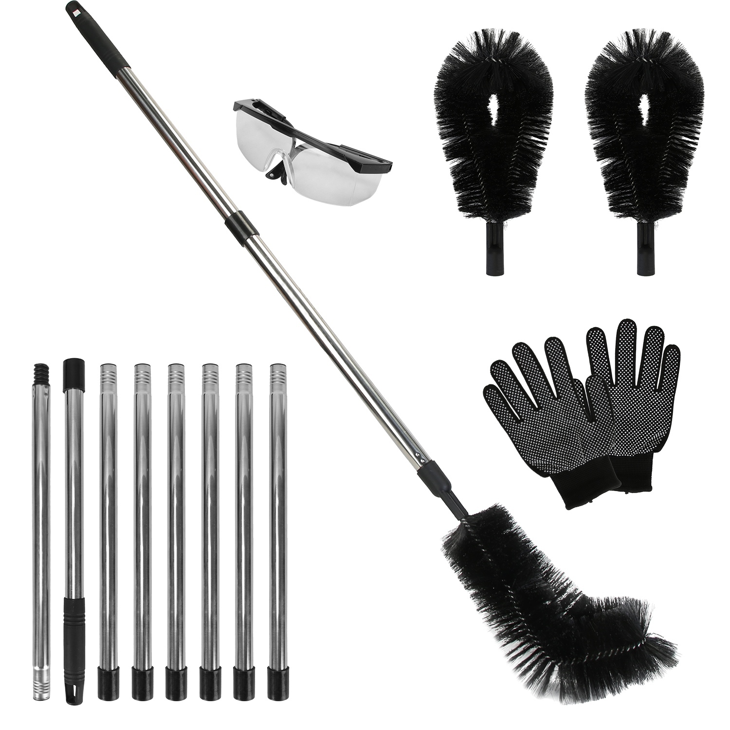 Are you tired of struggling to clean your rain gutters on the roof? With 8 stainless steel extension poles, our gutter cleaning brush with telescoping handle extends up to 10.5FT, allowing you to effortlessly clean your gutters from the ground. The 2 nylon bristle brushes can be bent to your desired angle, enabling you to reach hard-to-reach spots and effectively removing leaves and debris. No need to climb a ladder, safe and efficient. Also come with 1 pair of anti-slip work gloves and protective goggles for enhanced safety. Easy to assemble and store.