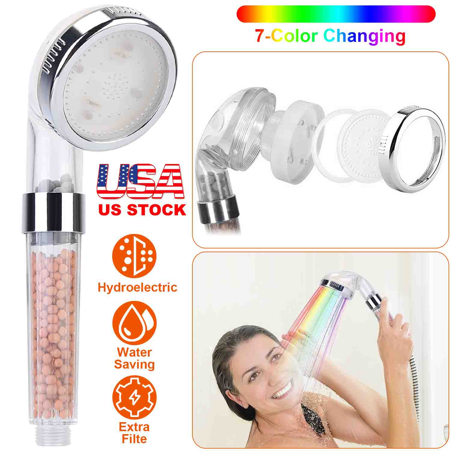 Do you worry about poor water to damage your skin and hair? Our shower head with filter system can eliminate most harmful chlorine heavy metals, impurities and bacteria in water as well as increase water’s PH levels to improve cell viability and skin hydration. Extra 7-color auto-changing light creates beautiful waterfall of lighting when bathing, making your bath experience more pleasant. It's simple to assemble with the general G1/2” threaded hole and just relax yourself and enjoy bathing!