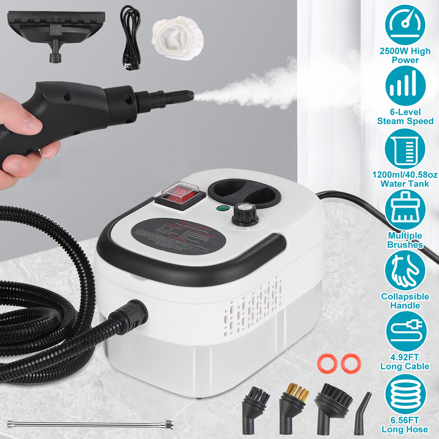 Our 2500W powerful steamer cleaner with 3 Bar steam pressure and 100℃/212℉ high temperature, is ideal for cleaning any stubborn stains in the corners/gaps, tough grease and grime on the surface effortlessly. Suitable to clean countertops, kitchen appliances, microwave, and even floors a breeze. 1-6 Level steaming adjustment helps to tackle various cleaning tasks precisely. Comes with 3 kinds of brushes, 1 high pressure nozzle, 1 window scraper and cloth cover, helping you to deal with most of your house cleaning problems. Besides, a collapsible handle allows for easy carrying. The 6.56ft air hose and 4.92ft power cable allow for flexible cleaning demands. 1200ml/40.58oz Water tank helps you to focus on cleaning for a long time and reduces need to add water frequently, providing work efficiency. A must-have house cleaning tool.