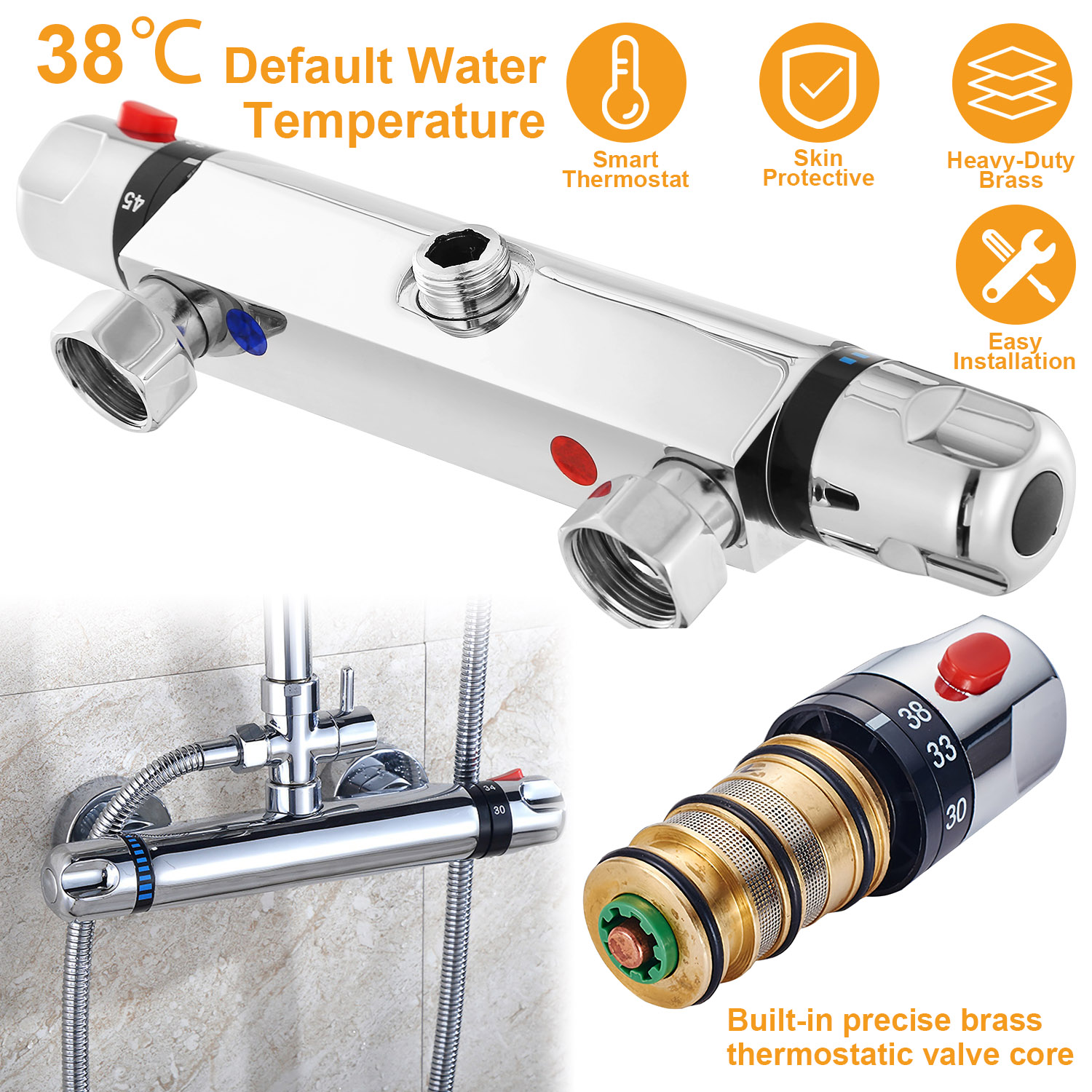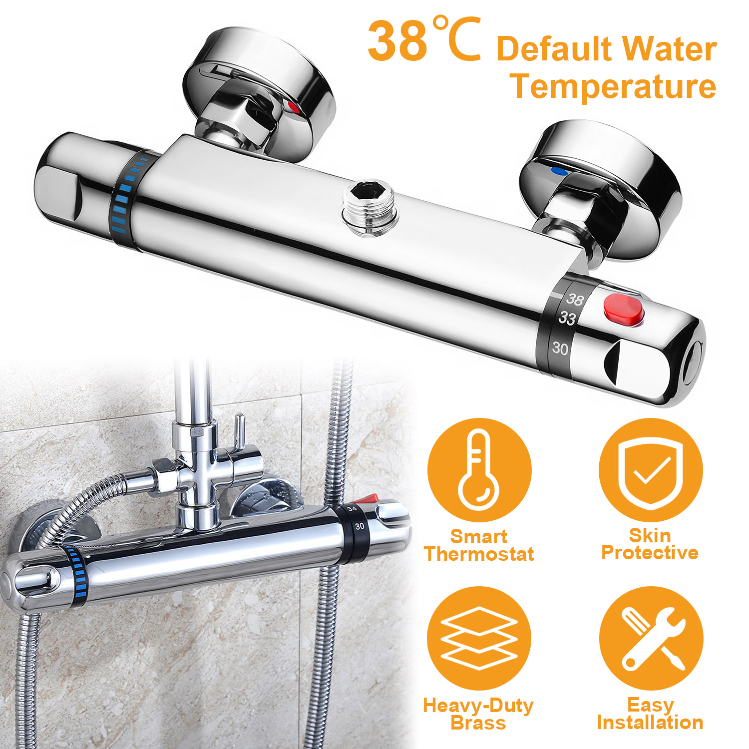 Compared to normal shower tap, our thermostatic shower tap built-in precise brass intelligent thermostatic valve core can provide a proper water temperature that you pre-set directly without repeated water temperature adjustment to save water, save money and save time. And if the cold water supply is failure, the hot water supply will automatically shut off, vice versa, to protect your skin from hurt. The default temperature of our thermostatic mixer is 38℃ which is the most comfortable temperature value fitting different ages. Additionally, a red button is designed at the top of the anti-slipping water temperature adjustment handle to provide more security that is you can only set the water temperature up to 38℃ while pressing it.