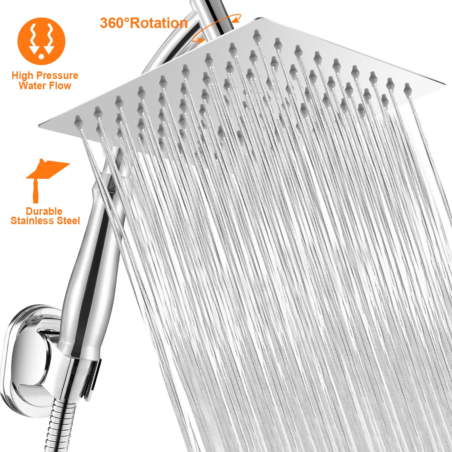 Our 8 x 8inches ultra-thin (only 0.2inches thickness) is built-in energy-saving and pressure-boosting device and evenly distributing 81pcs anti-clogging and easy-cleaning silicone nozzles to effectively increase water pressure, speed up water flow, offer you rainfall experience and save water. Additionally, the top of our shower head designs a flexible joint which allows you to freely adjust the angle of shower head through 360°horizontal rotation and 15°flapping. Peace of your mind with its high-grade stainless steel materials and premium polished chrome finish.