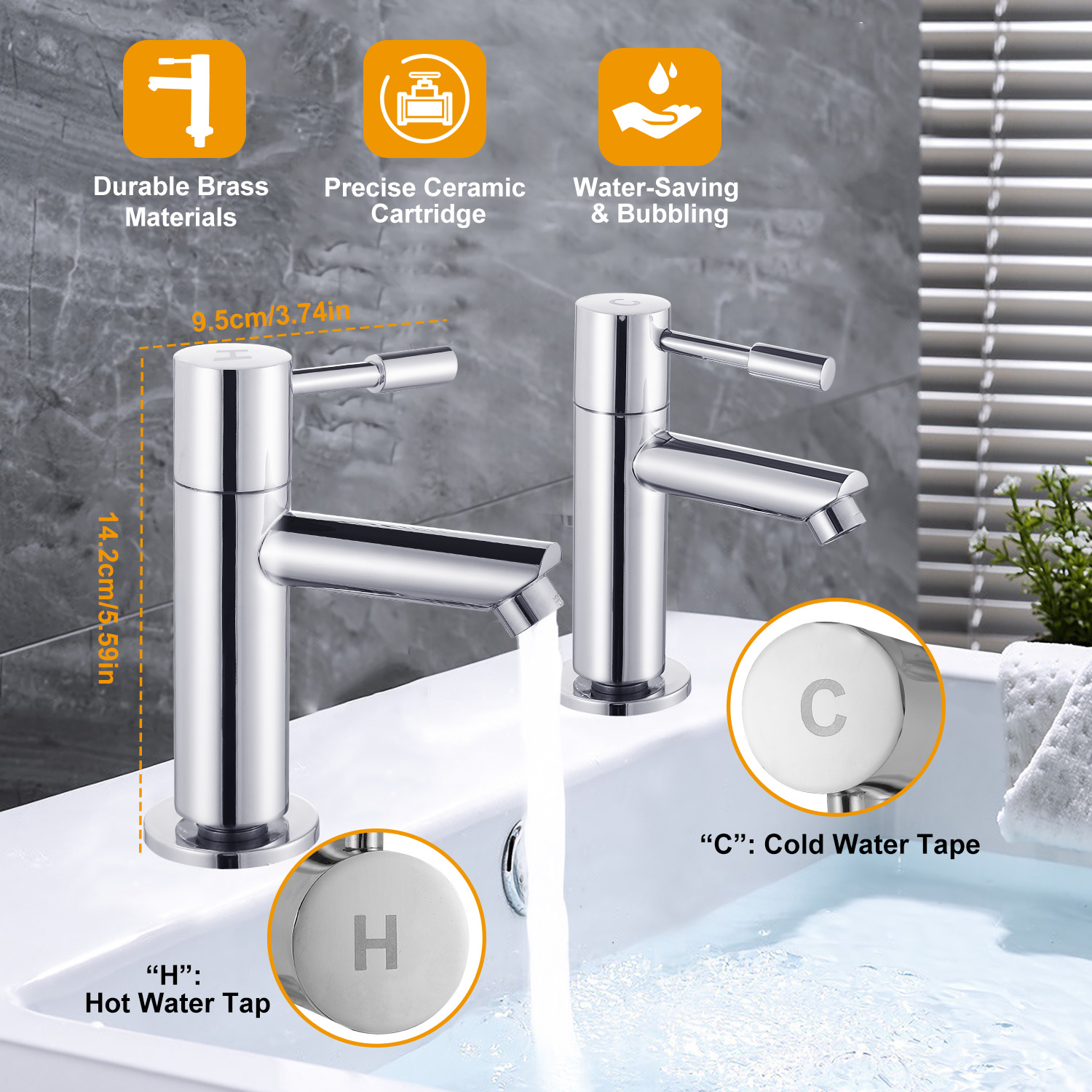 Our bathroom sink faucet adopts high-grade brass materials and premium multi-layer electroplating and polishing finishes, safe, high-heat temperature, abrasion resistant, anti-corrosion, anti-rust, long lasting and gorgeous to match your bathroom. It features precise anti-leaking and abrasion resistant cartridge and no splash soft water flow to create a great use experience. Additionally, package includes 1pcs cold water tap and hot 1pcs water tap which is suitable for 2-hole installation to separately connect cold water inlet hose and hot water inlet hose. And a capital letter “C” is considerately marked on the top of cold water tap and “H” on the top of hot water tap to avoid any confusion.