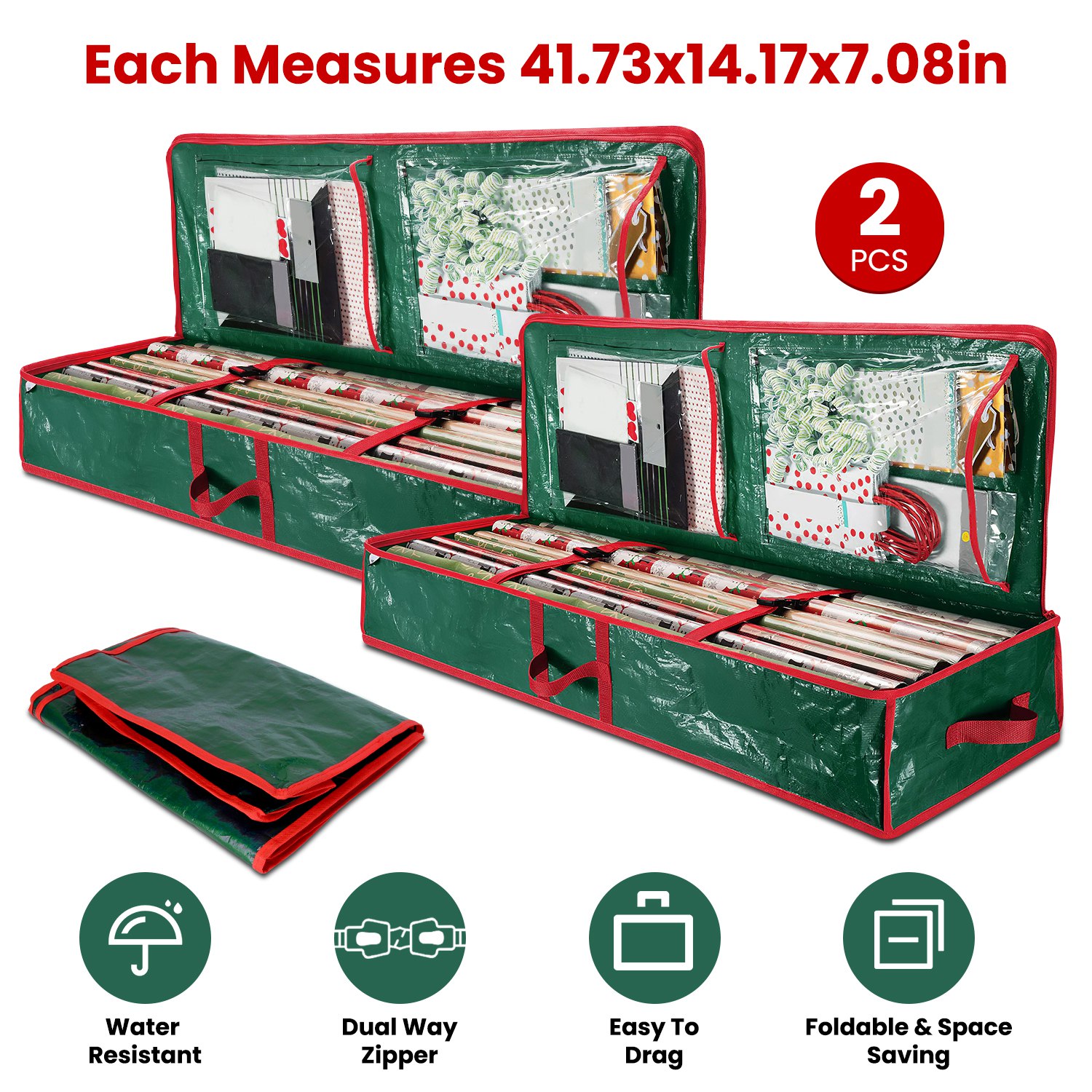 Would you like to have miscellanous holiday wrapping supplies all in one container to keep room neat? Our 2 Packs of storage bag provide spacious room for you. Come with dual transparent vinyl pockets, store labels, scissors, tapes and other accessories in well organized. Each bag measures in 41.73x14.17x7.08in, store wrapping paper in rolls and dual adjustable buckle straps will keep rolls in place, and won’t shake arbitarialy when drag from one room to another. Dual way zipper makes easy access to wrapping paper. When not in use, these 2 packs of storage bags can be folded to save space.