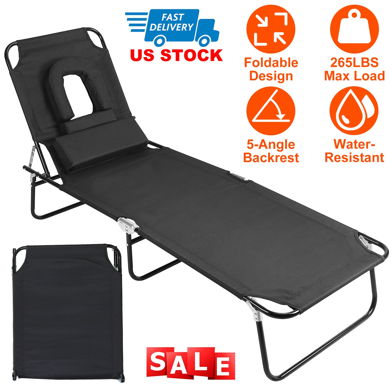 Home > Folding Beach Lounge Chair Face Down Tanning Chaise Sunbathing Recliner 265LBS Max Load with 5-Angle Backrest 3 Removable Pillows for Beach Pool Lawn