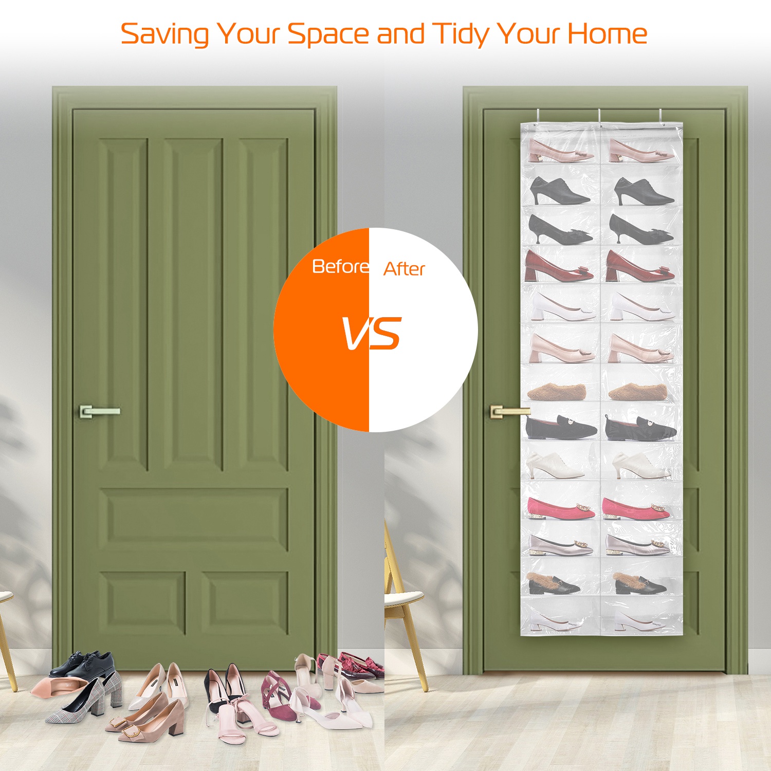 Our shoe rack combines with premium non-woven fabric, thickening transparent PVC material, high-density hardboard and heavy-duty metal hook, sturdy, durable and not easy to out of shape or damage. And its user-friendly over-the-door design with 26 endurable pockets can organize 13 pairs of shoes to greatly save your space. It can be placed on any doors which its thickness is within 4cm/1.57in and the crack of the door is more than 2mm/0.08in.
