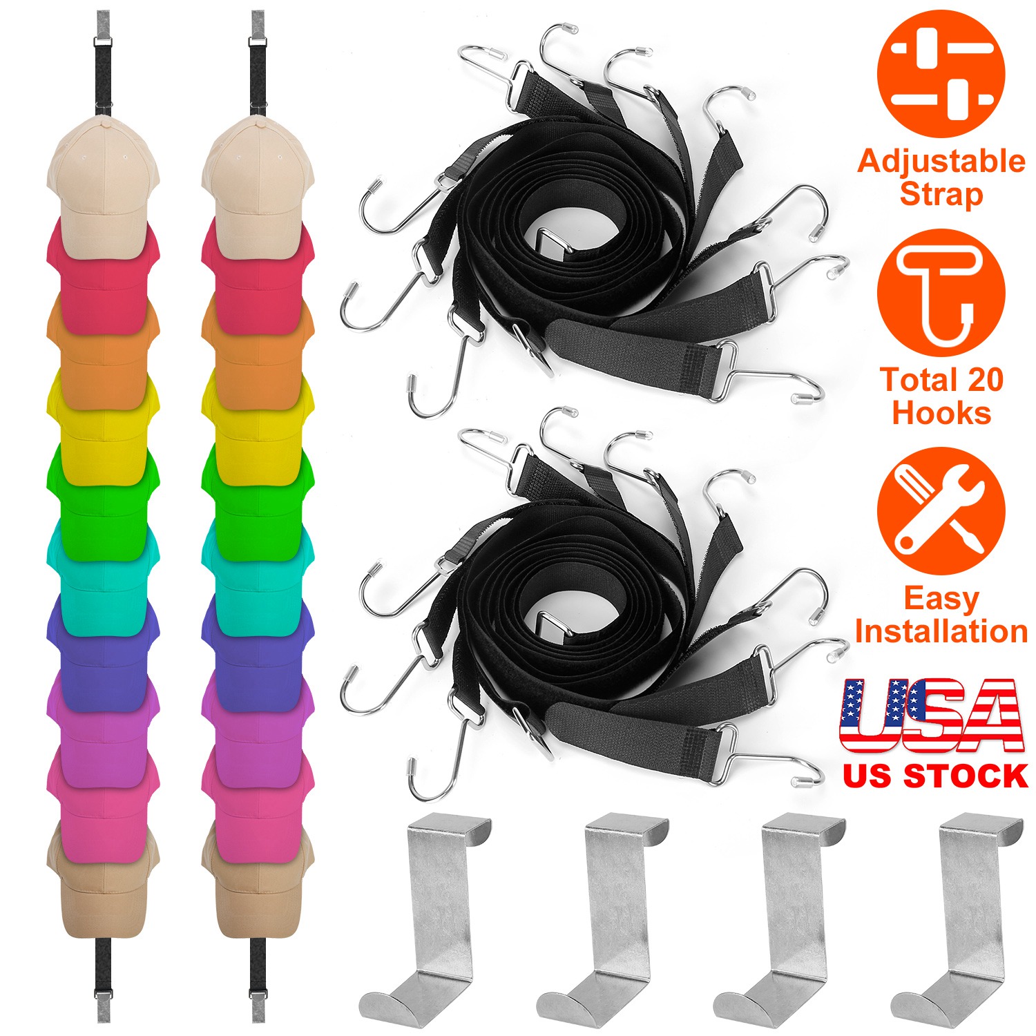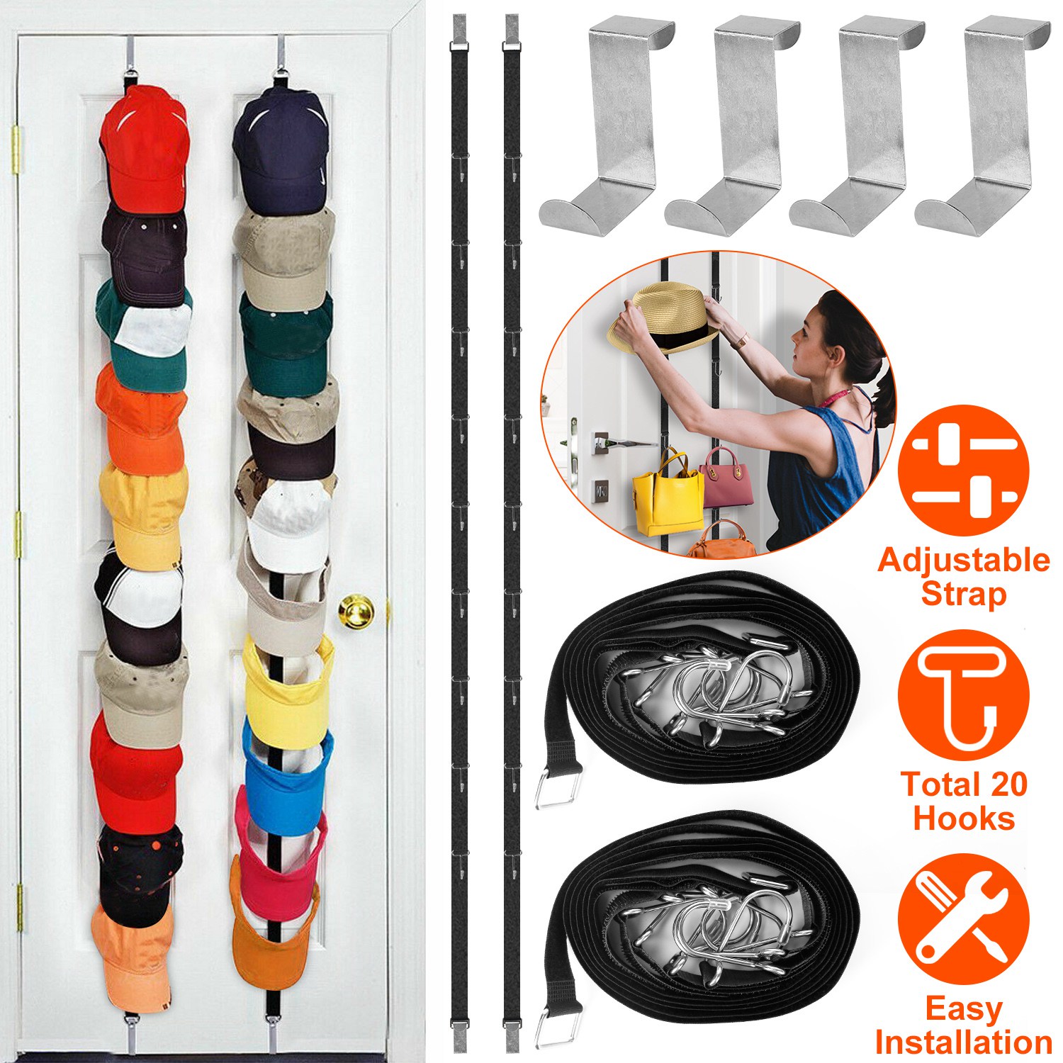 Hanging our hat rack over the door, you can organize all hats and other items like socks, gloves to keep your room clean and orderly. It can hold up to 8.8lbs on whole strap and 1.1lbs on each hook, ideal for daily use. Adjustable length and hook & loop design hooks allow you to make the strap fit your door well and fasten the hanging hook in the place as you want. With two separate straps, you can use them in two different rooms for hanging various items.