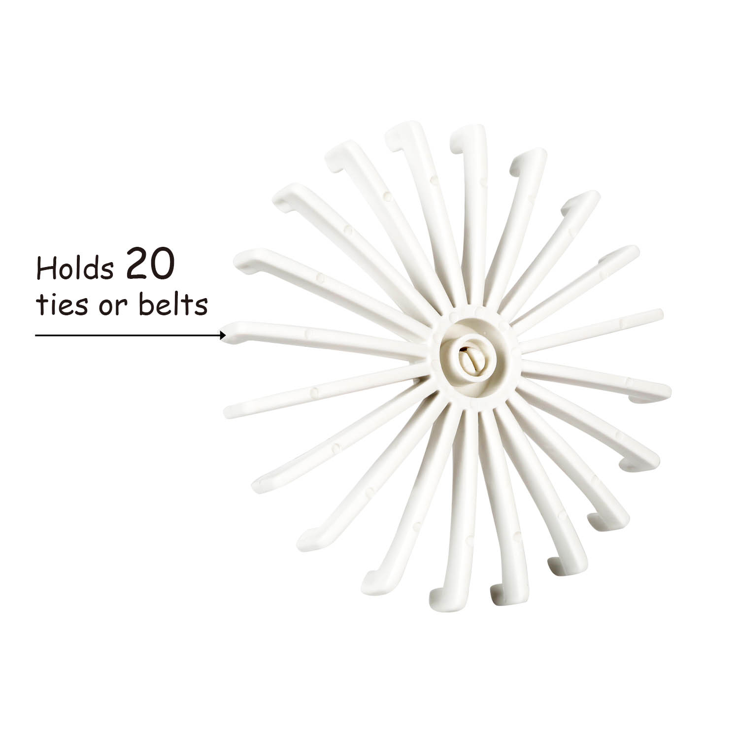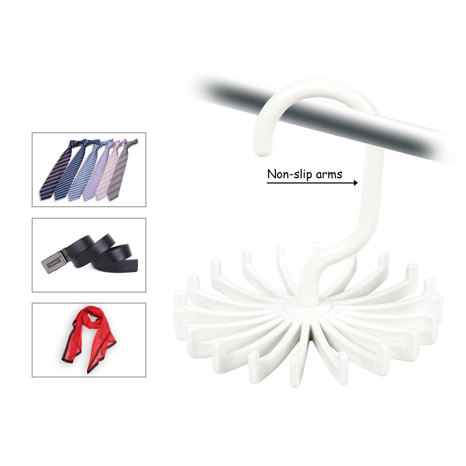 Spin your way to a dressy day! This Rotating Tie Rack is perfect to organize your favorite ties, scarves, or belts! Reduce the clutter in your closet and find the accessory you need to be at your best. Designed with heady duty plastic with 20 no-slip hangers, this is a must have item for your closet.