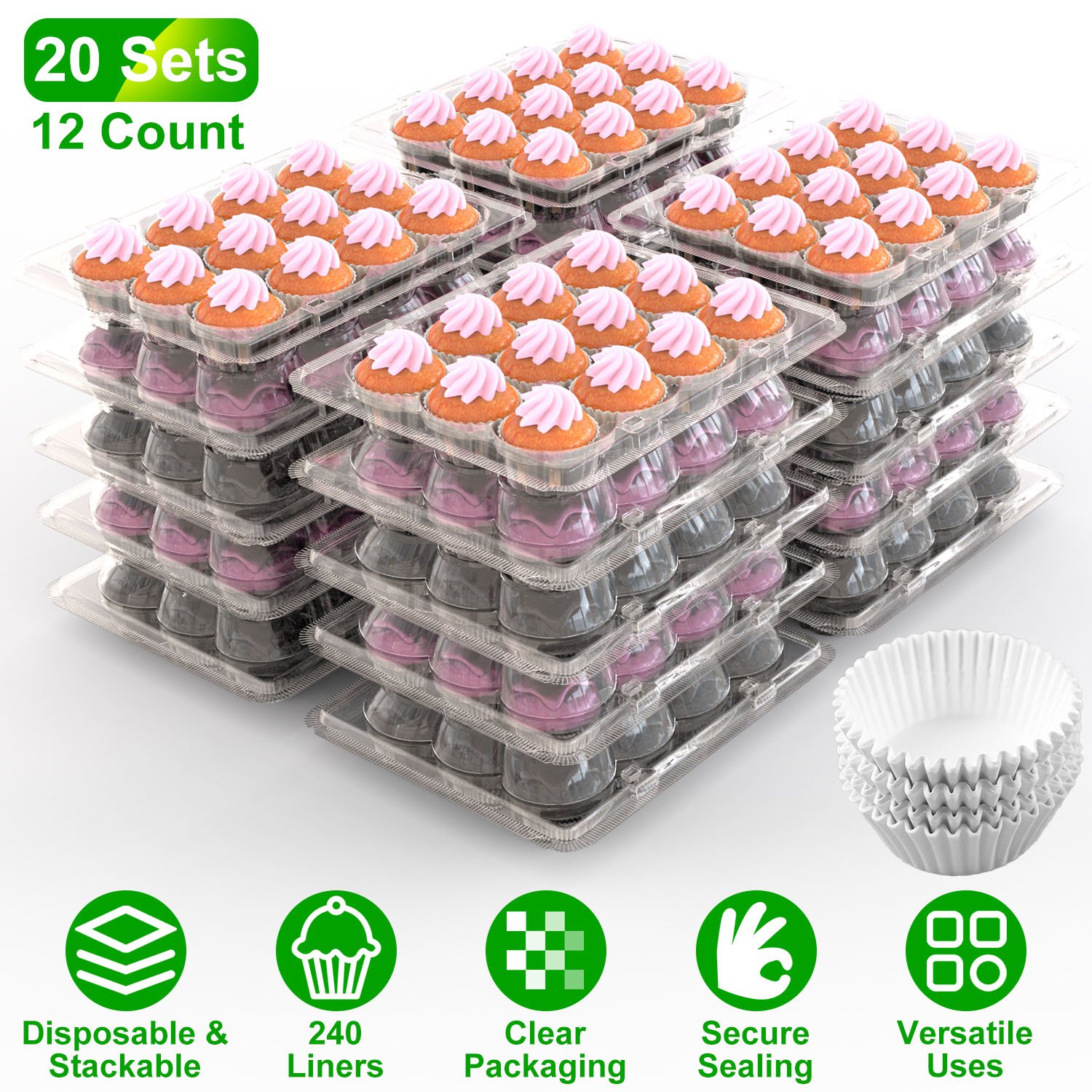 12 Count 20 Sets Clear Cupcake Boxes Disposable Cupcake Containers Stackable Cupcake Carrier Holders with 240 Liners High Dome Lid