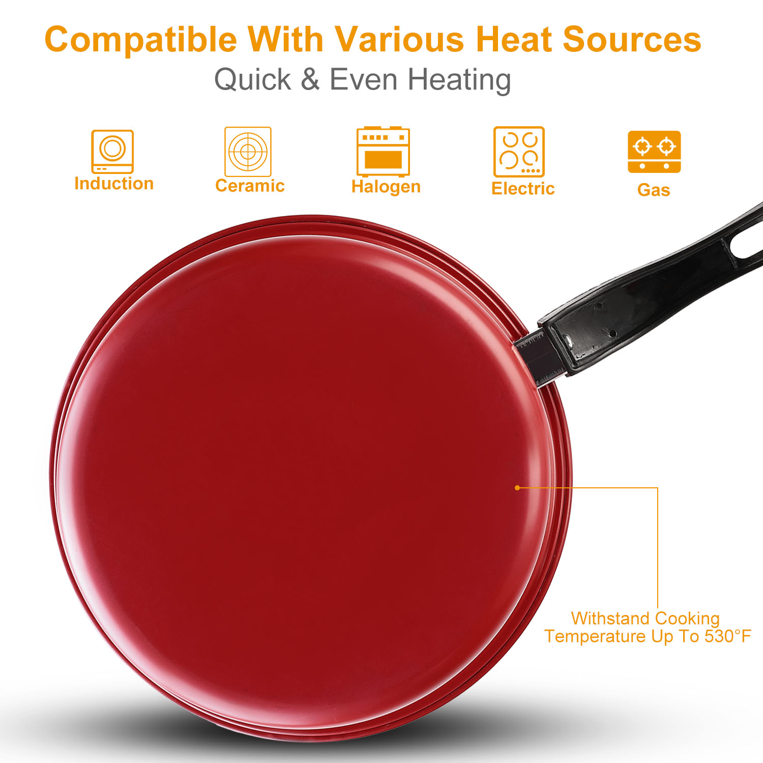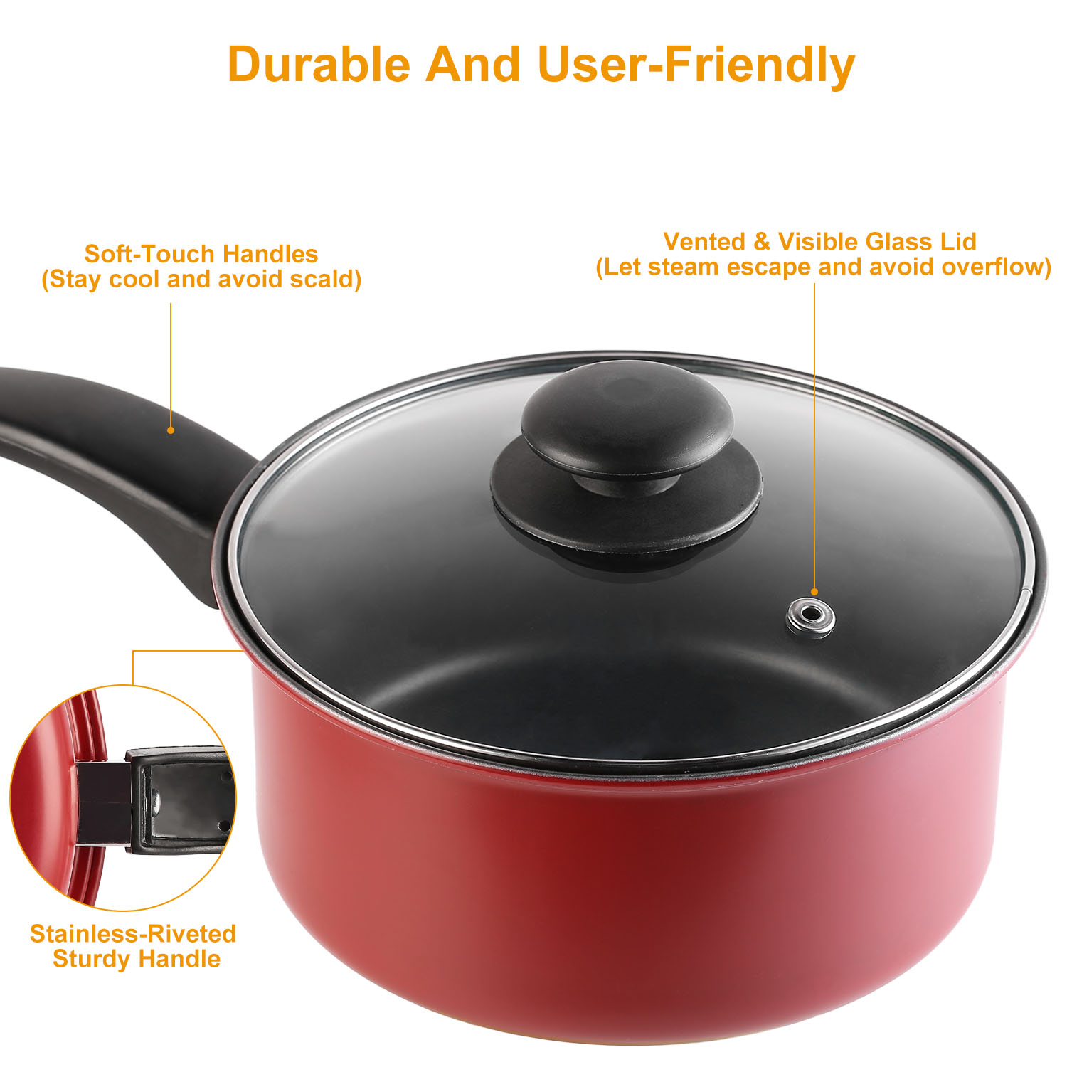 Our 7Pcs Nonstick Cookware Set includes 2 sauce pans, 1 fry pan, 1 casserole and 3 lids, which feature nonstick and allow for lower-fat cooking options, and no need for excess butter or oil. Moreover, it helps prevent cooked food from adhering to the pan, so that your food can be effortlessly transferred to a platter or dinner plate for gracious serving. Our 7Pcs Nonstick Cookware Set basically meets all you stovetop needs. It makes your cooking in kitchen more convenient and efficient. Go to have it, cook what you want for your lover, family and friends with our cookware set and enjoy your happy cooking time in kitchen! Also, its design of compact, portable and lightweight make it easy storing if not use or carrying when having a picnic outdoor.