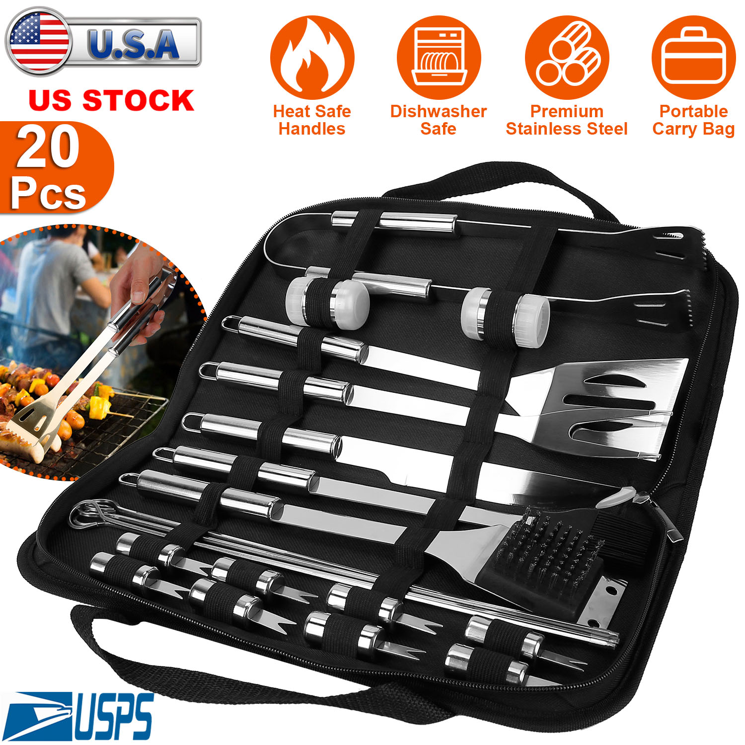 Each BBQ tool has been specifically designed for ease of use and comfort. Ergonomic grips and exquisite balance will make them feel like an extension of your arm. With these 20pcs BBQ tools, you can flip, skewer, and drag food like a real barbecue master. Made of premium stainless steel materials, they are won’t rust and crack, easy to clean and dishwasher-safe. BBQ tools set in a portable bag allow more convenient outdoor cooking. It is a perfect gift for you and BBQ lovers, an ideal choice for Fathers' Day, Christmas, Birthdays and more.
