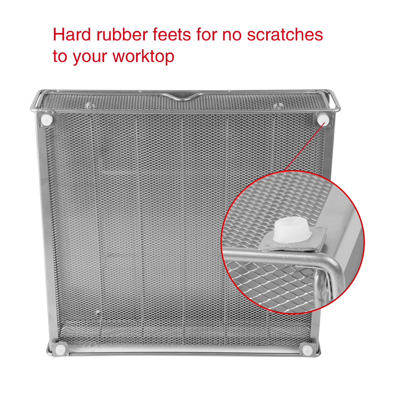 This coffee machine stand is made of metal mesh welded/soldered over a metal frame, sturdy enough to hold your Keurig machine. The drawer has 6 rows with room to spare for capsules organizer, and each row holds 6 K-cups. Refillable cups can fit into the rows, too. If you spill water onto the top of this stand by accidentally while refilling the Keurig, you don’t have to scramble to wipe it up right away, because the water will puddle there without seeping through. Brilliant convenience to your neat lifestyle.