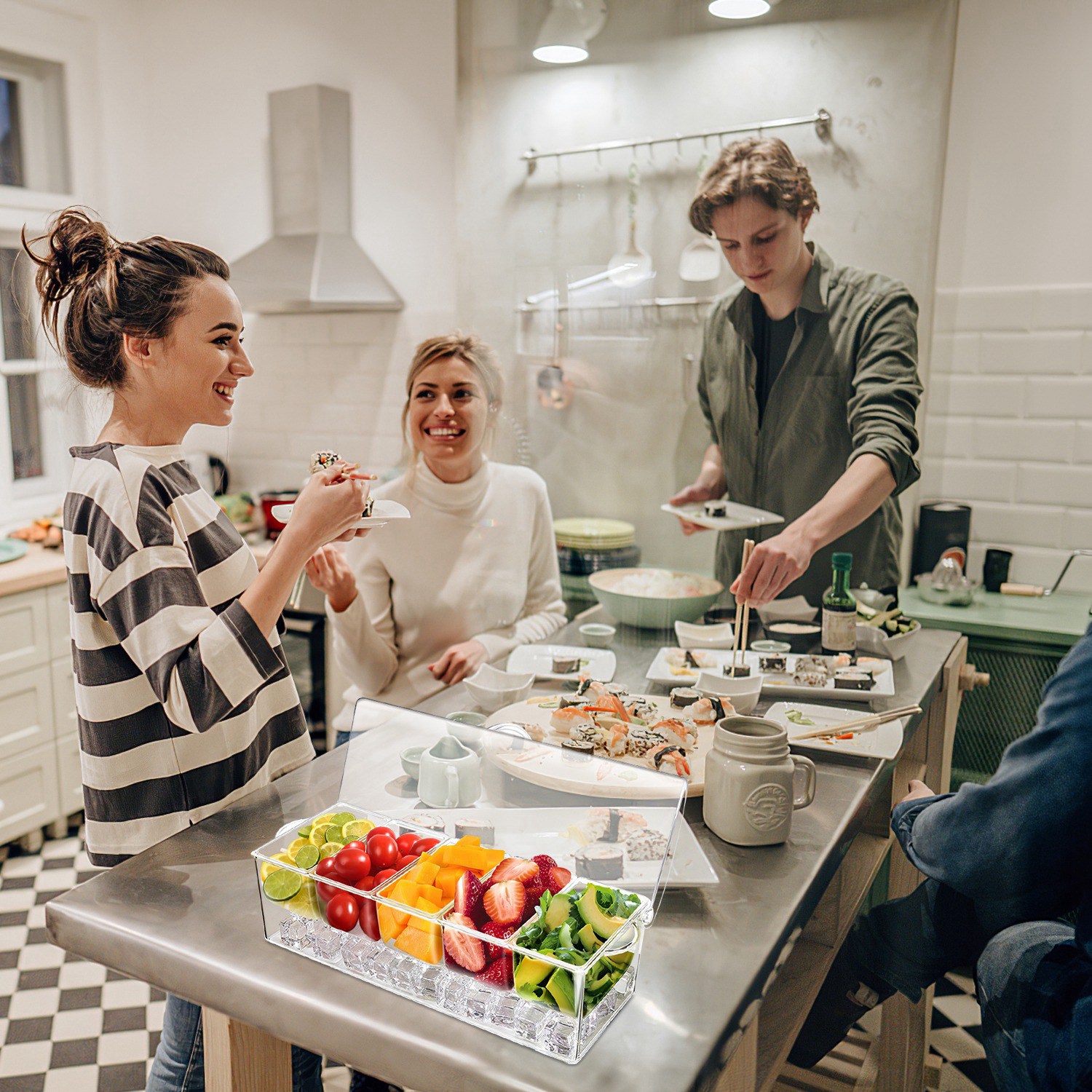Designed with 5 removable compartments, our condiment server with transparent appearance has spacious capacity to hold various food, like fruit, vegetable, sauces, garnish and so on. Extra bottom compartment allows you to fill ice cubes to keep food cool and fresh. Easy opening lid can prevent dust and insects. Made of BPA Free, food grade material, ensure your safety, and support dishwasher, easy to clean. Suitable for indoor and outdoor parties, like family gatherings, company events, cookout, BBQ, picnic, camping.
