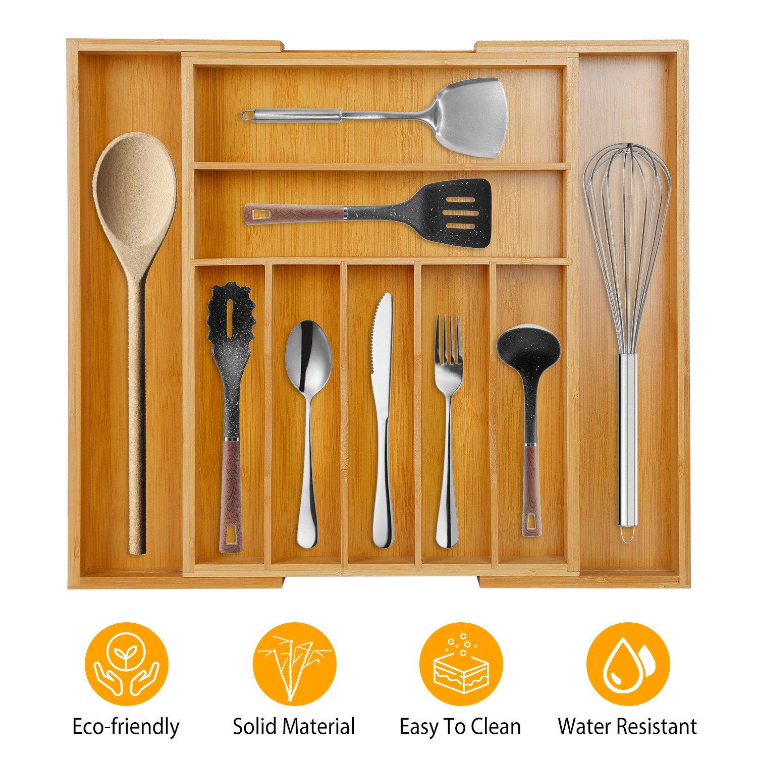 The bamboo utensil drawer organizer has 9 deep compartments and you can create a custom storage solution to meet your needs. This bamboo silverware tray organizer is helpful in keeping kitchen supplies, bathroom supplies, manual tools, makeup accessories, and office supplies organized, neat, and tidy.