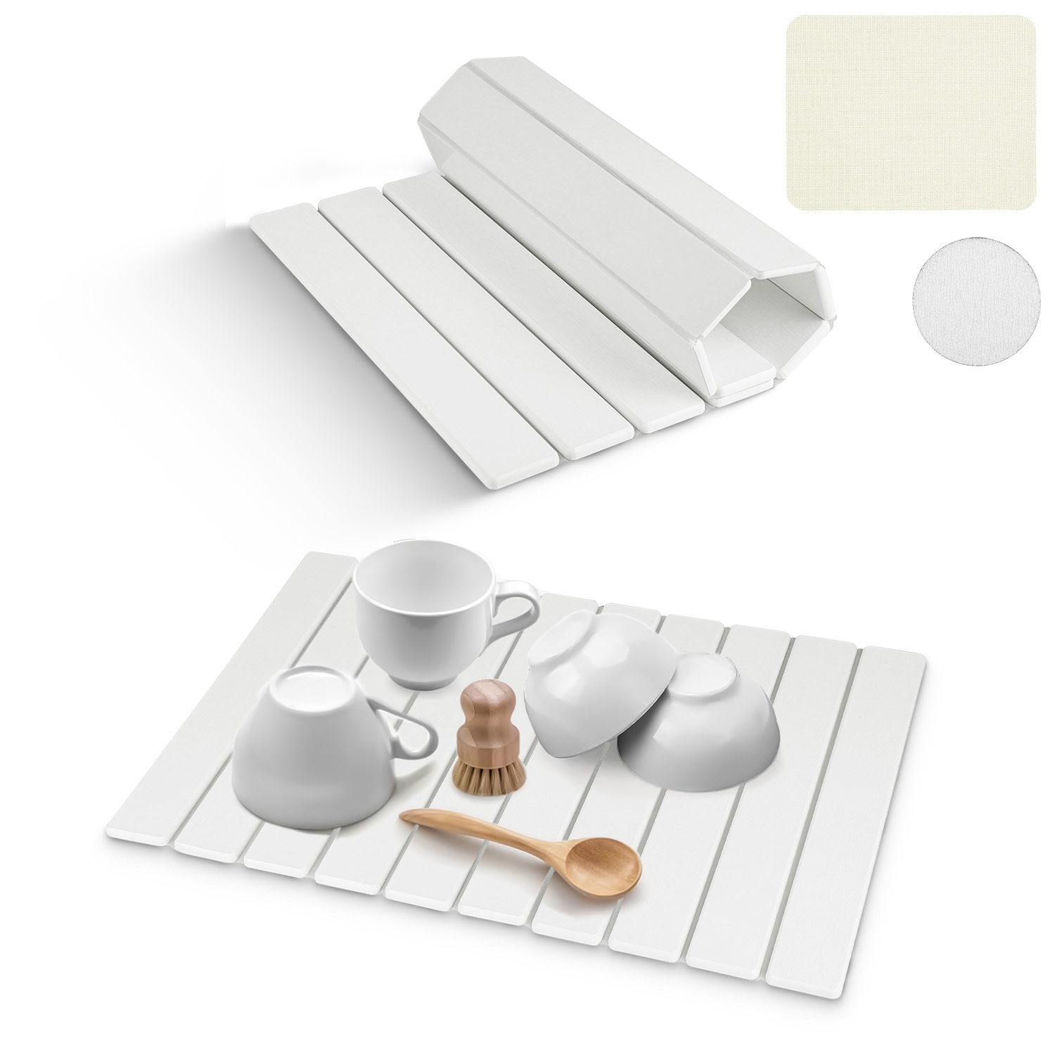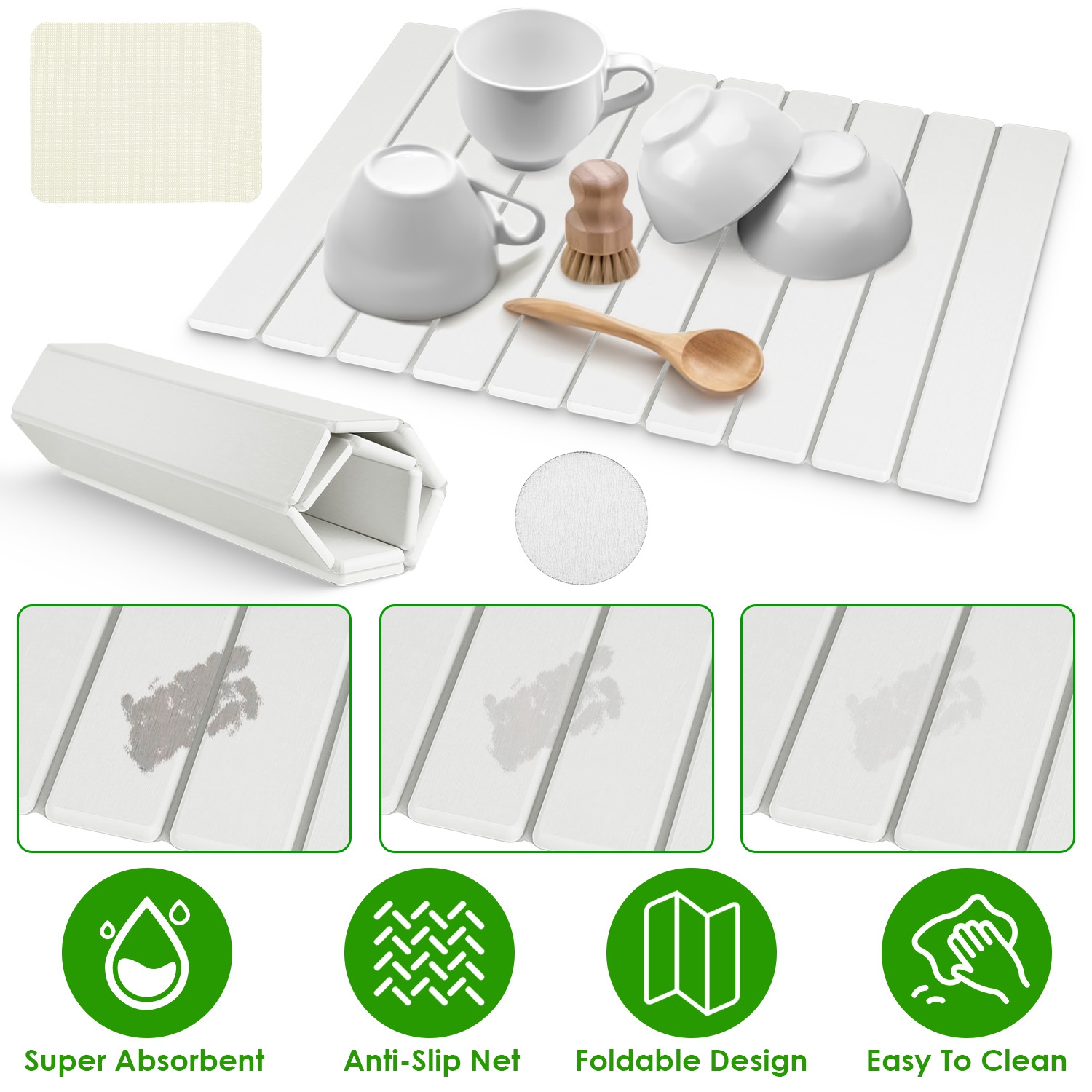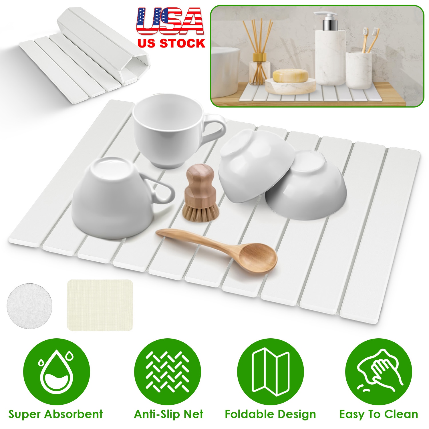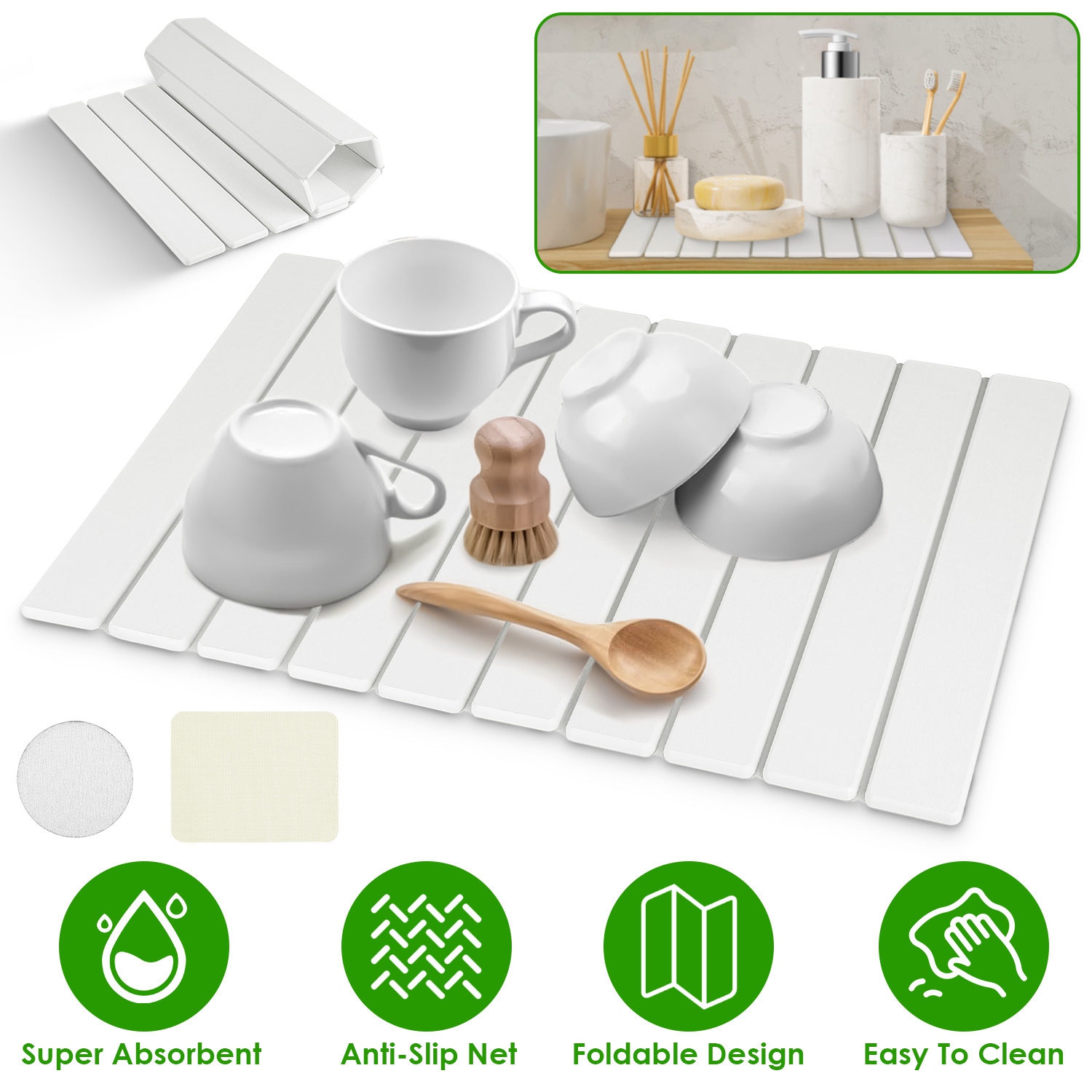 Your kitchen countertop is always wet and easy to get moldy? This instant dry dish drying mat is an absolute game-changer! It's super absorbent, great to absorb moisture and evaporate instantly with no water stains remain, which can keep your countertops clean, dry, and organized. Plus, folding design makes it easy to store into the drawers or cabinet when in use. Perfect to use in the kitchen or bathroom to hold your tableware or toiletries. Easy to clean with warm water or included sanding pad.