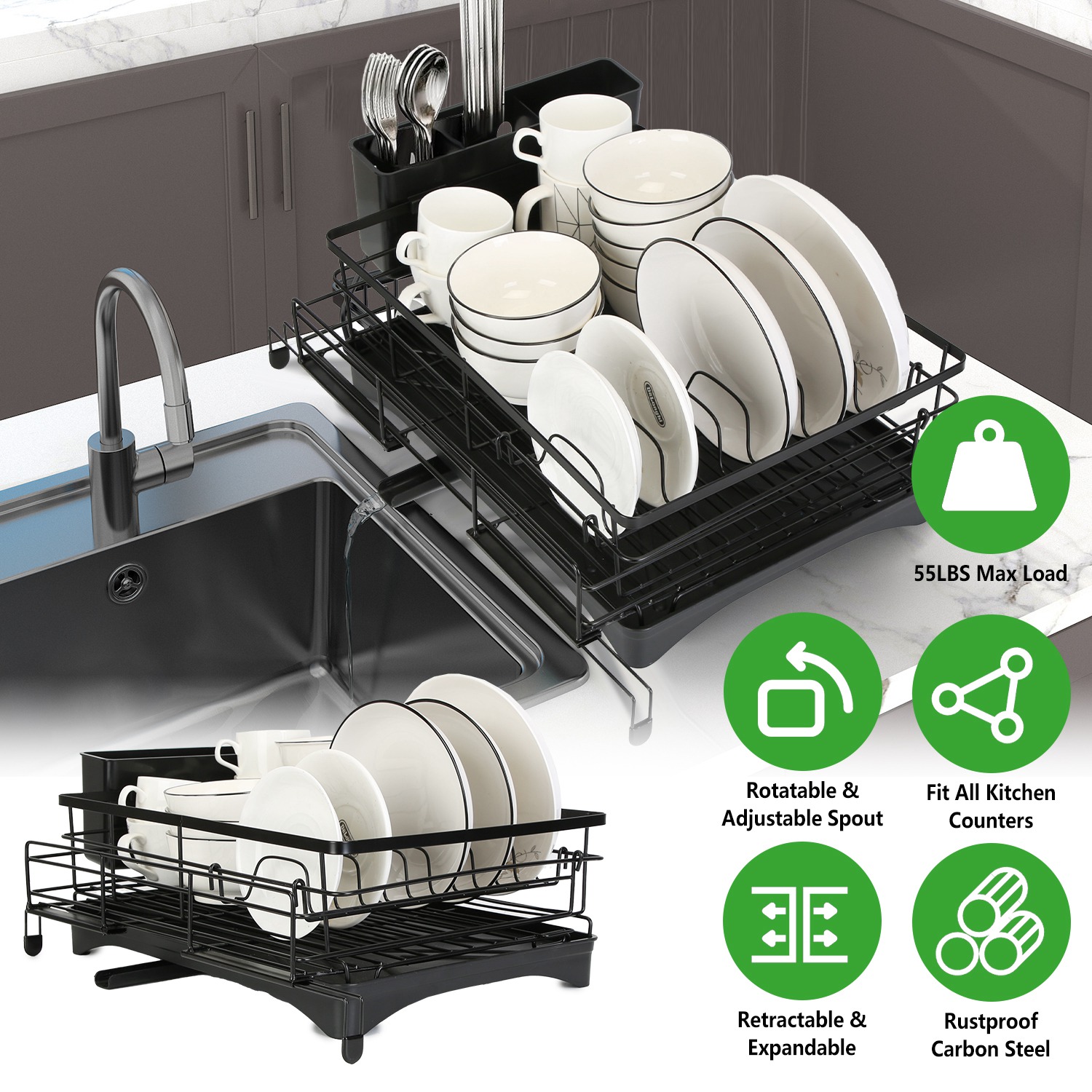 Keep your kitchen counter tidy and well-organized with our extra large dish drying rack! Our expandable dish drying rack features retractable design which not only provides extra large capacity to dry tableware of varies sizes such as plates, dishes, mugs, pot lids and bowls, but also can retract to save 45% space when not in use. Able to fit all kitchen counters and sinks with extendable feet. Rustproof and sturdy enough to bear 55lbs weight. Come with a drainboard that features 360º rotating and length adjustable water spout for automatic drainage. Also include a dish rack and a utensil holder, streamline your life.