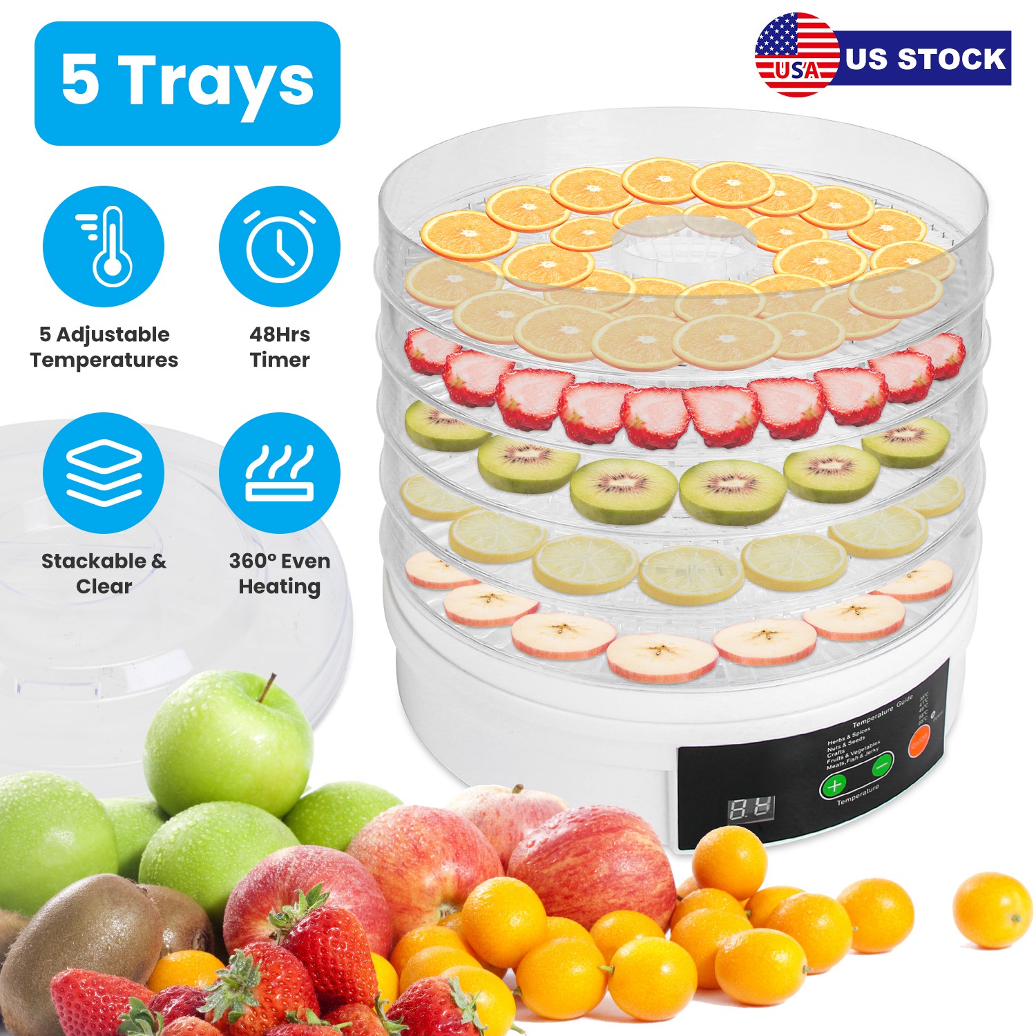 Featuring 5 temperature settings and timer up to 48 hours, this food dehydrator enables you to dry a variety of foods, such as fruits, vegetables, bread chips, herbs, seeds, nuts, meats etc.. 5 stackable clear trays for saving space and process monitoring. 345W pure copper motor for 360° hot airflow and even heating for each layer. Widely used for daily tea bags, healthier snacks, breakfast and picnic preparation, pet treats, cooking spices and so on. Eat healthier with our food drying machine!