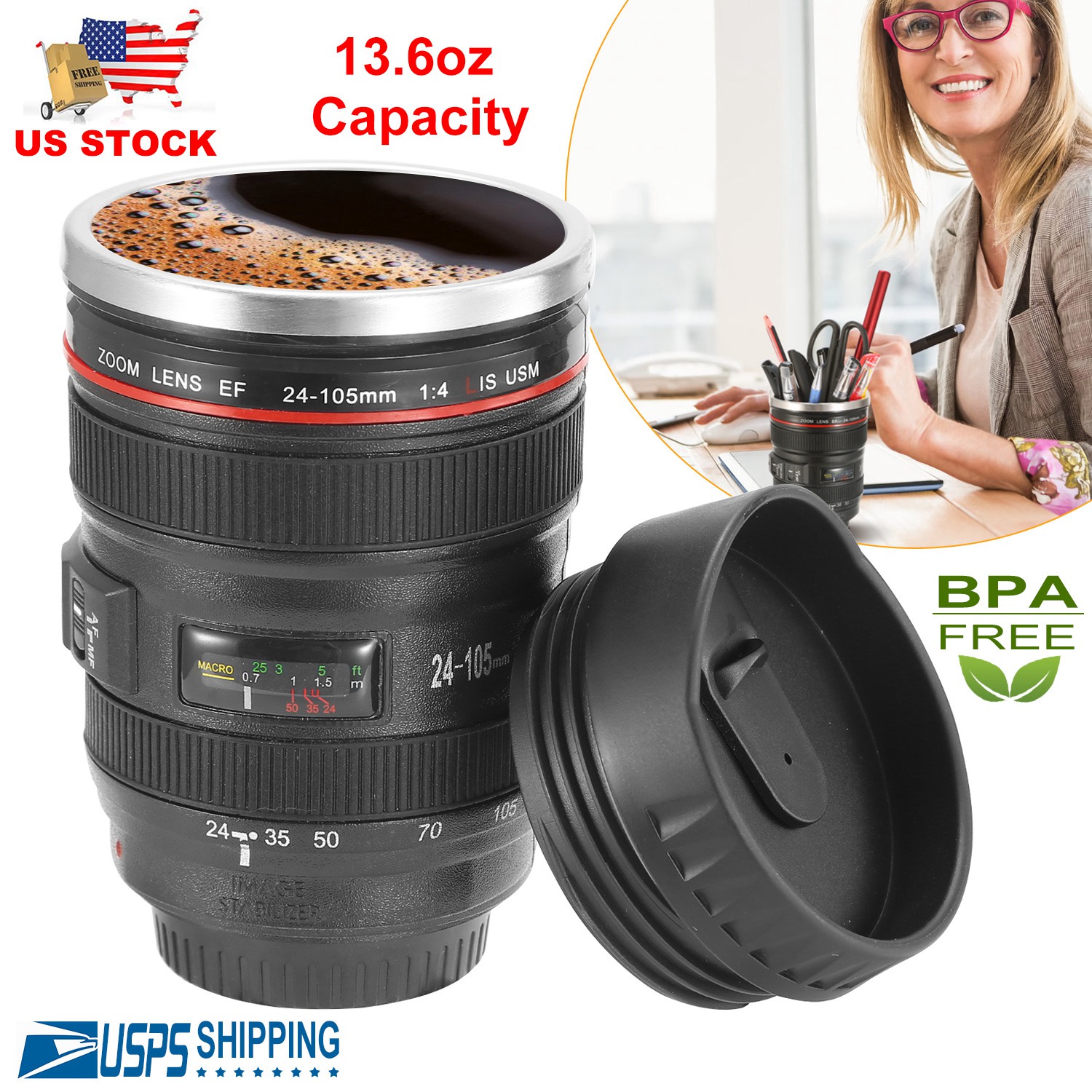 Our camera lens mug is a simulation to Camera Lens Model EF 24-105mm f/4.0L USM Lens with clear and anti-fading camera lens shape, which makes it a must-have collectible and amazing gift for die-hard photography fans and camera gurus. Made of food-grade ABS plastic materials and high-quality stainless steel inside, which is BPA-free and safe to use for drinking. With up to 400ml/13.6oz capacity and insulation function, coffee mug is great for outdoor activities instead of using disposable poisonous cups. Moreover, it’s also practical to use as a cup, ashtray, money box and pen holder!