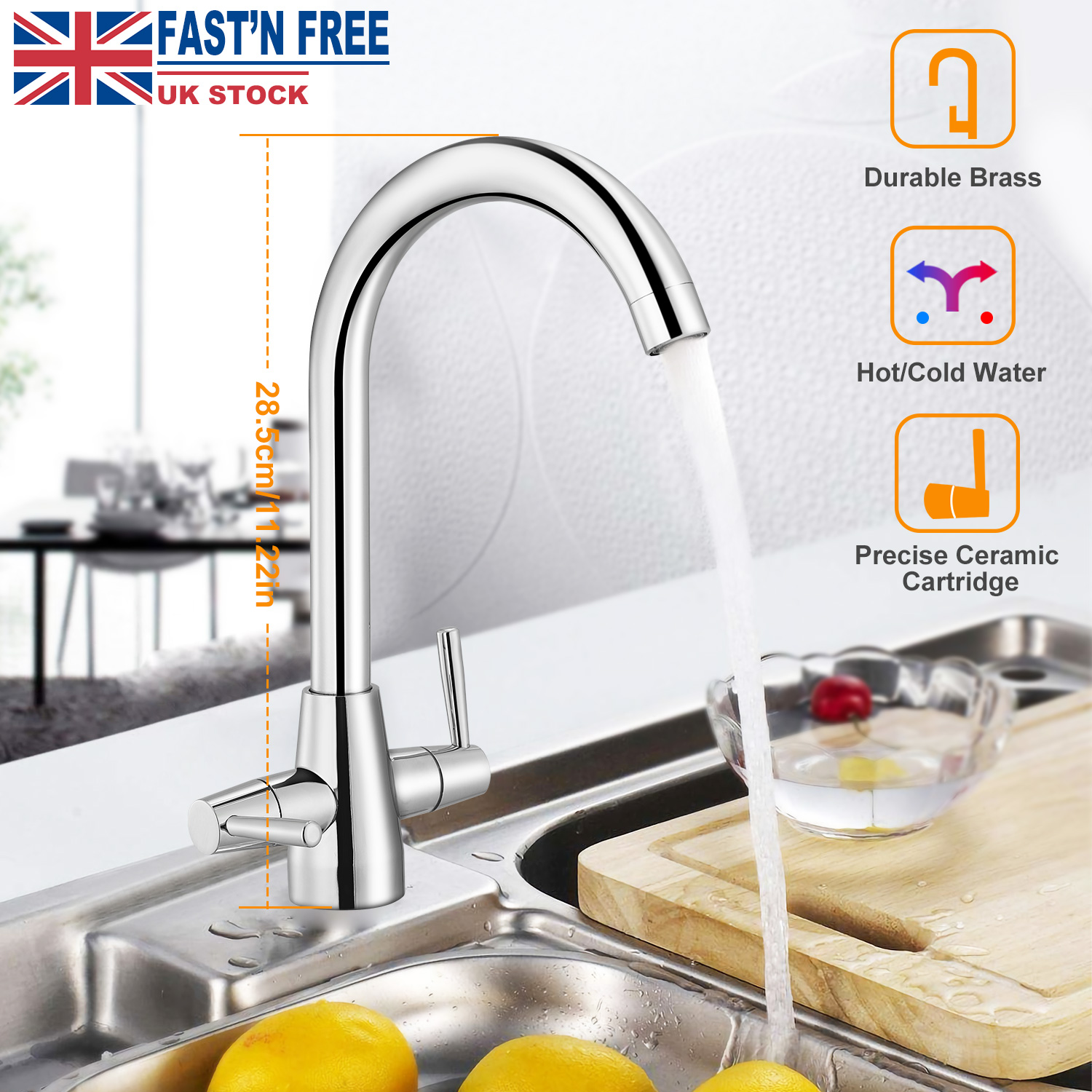 Kitchen Sink Faucet Two Handle One-Hole Basin Hot Cold Mixer Tap Brass Construction Chrome Finish UK Standard