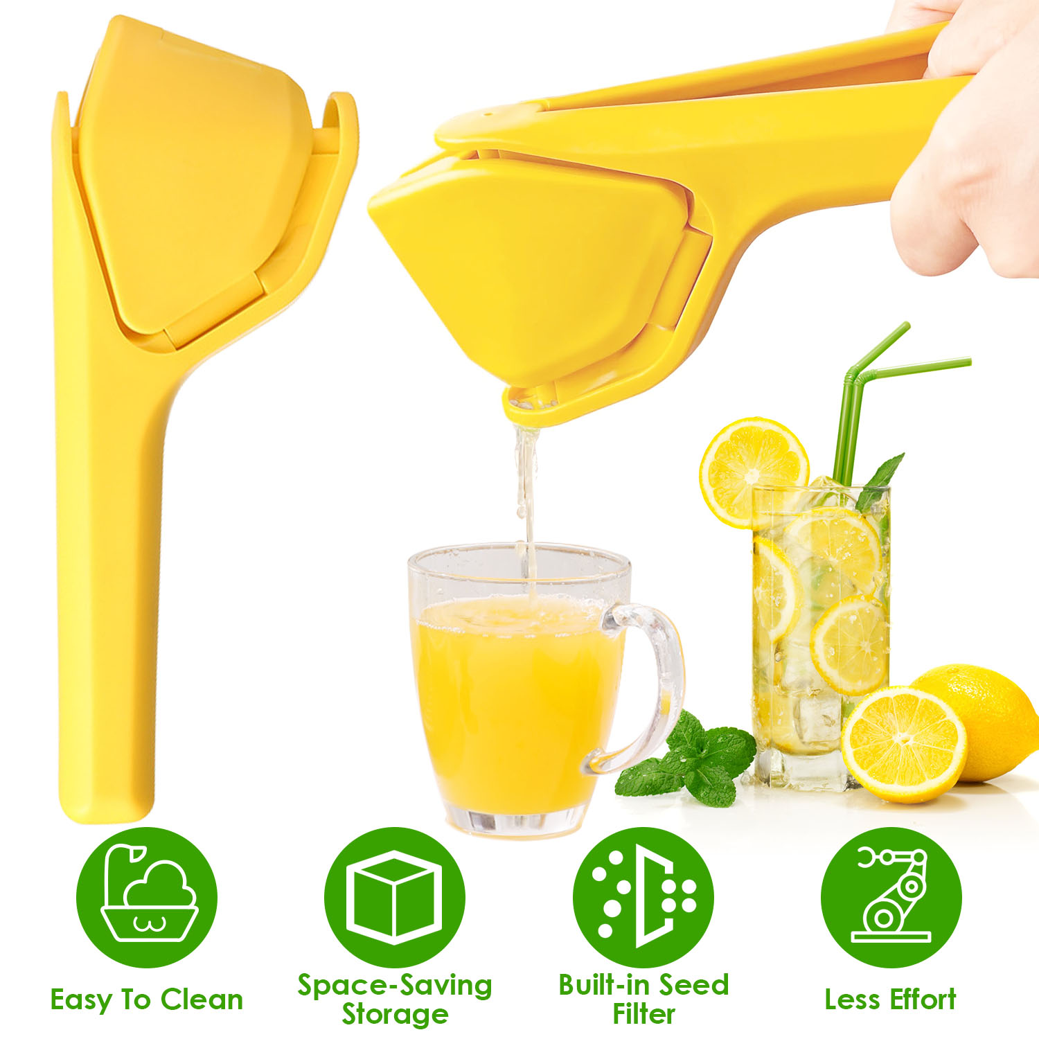 Featured with unique 2-handed sideways pivot operation, our lemon squeezer allows you to easily extract every drop of juice without wasting while reducing effort and fatigue. Built-in diversion port with filter prevents spills while directing the extracted juice into cups or bowls, and anti-slip particles securely hold the lemon in place. Additionally, compact and foldable design makes it perfect for any cabinet drawer or container, maintaining countertop tidiness and organization. Safe to use for extracting juice from various fruits such as lemons, limes, citrus, oranges, pomegranates, etc.. Make a cup of mouthwatering cocktails, soda water or fruit drinks with our manual lemon squeezer!