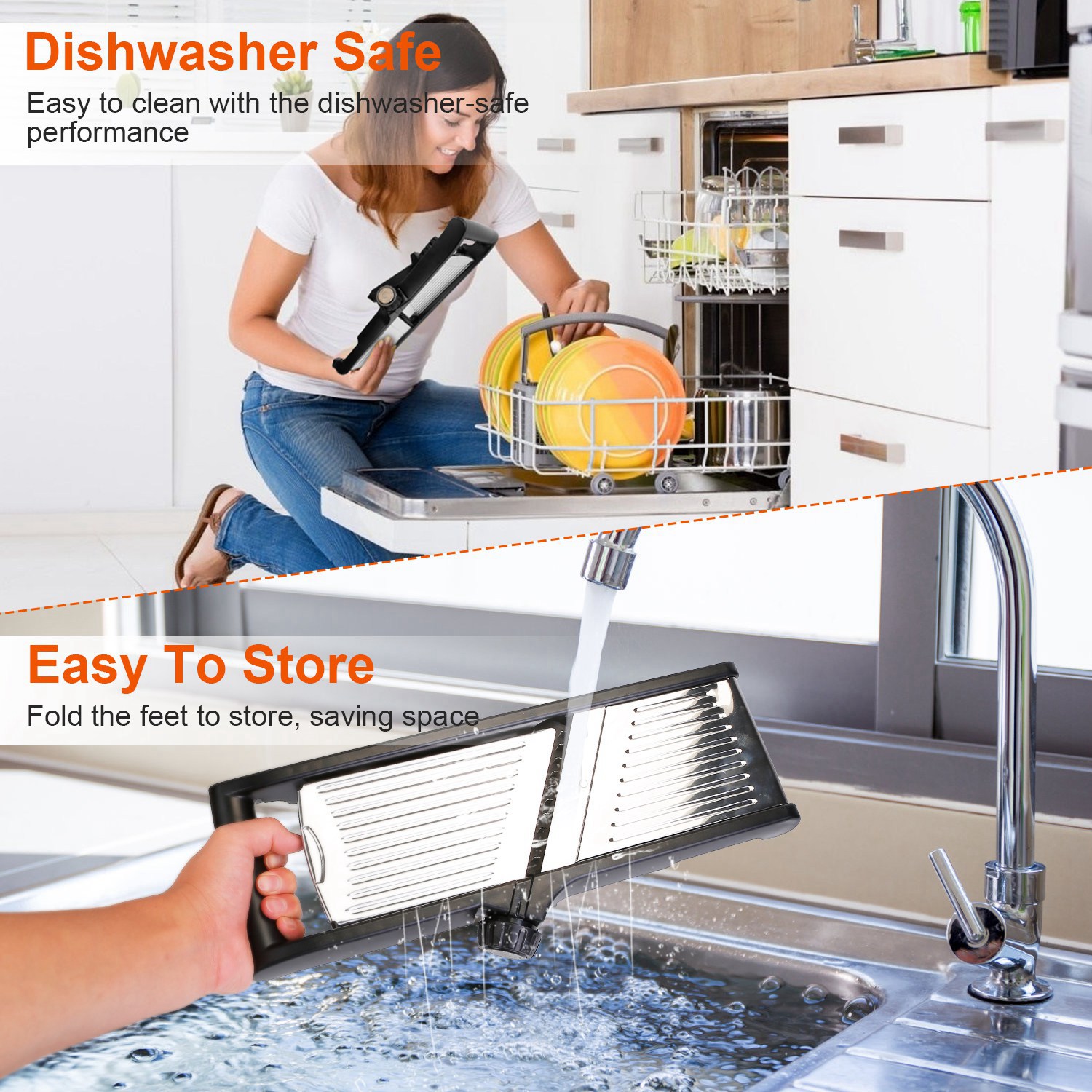 Are you tired from preparing lots of vegetables in kitchen? Use our multifunctional slicer, you can spend less time to prepare more food! Built-in blades of different sizes and shapes in a mechanism, simply adjust the knob to cut slice or Julienne with various thickness, super convenient! Perfect for cutting fruits and vegetables! Dishwasher-safe performance makes it easy to clean after use. Also easy to store after fold its feet.