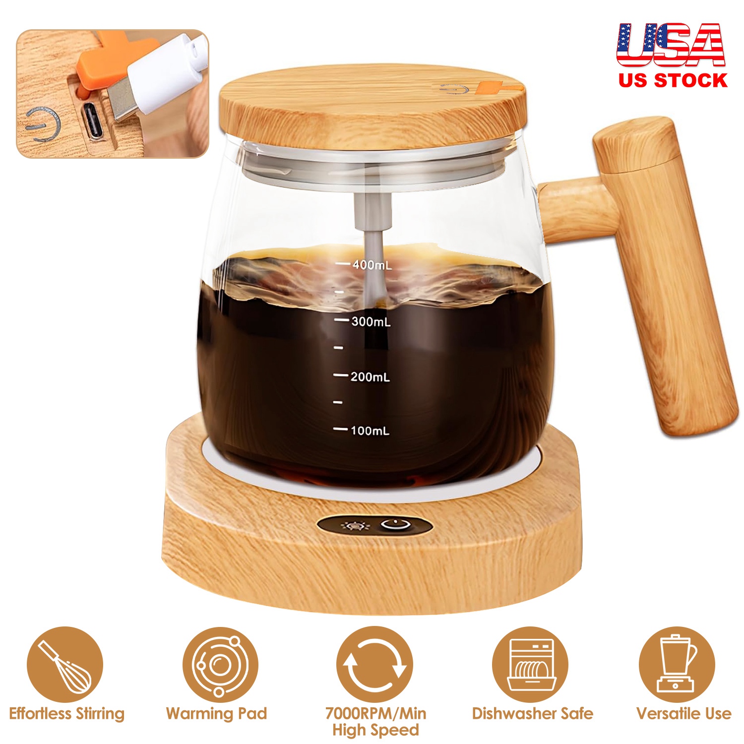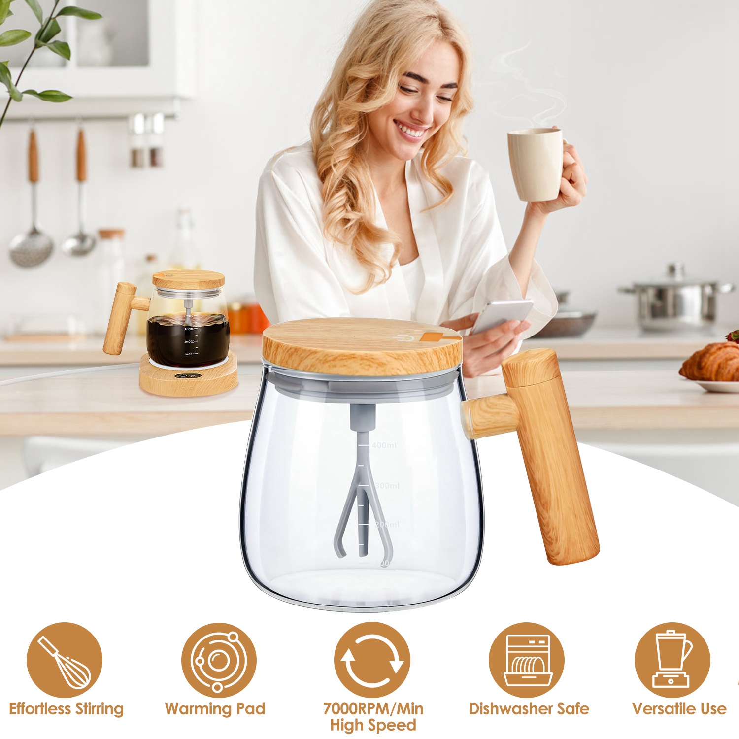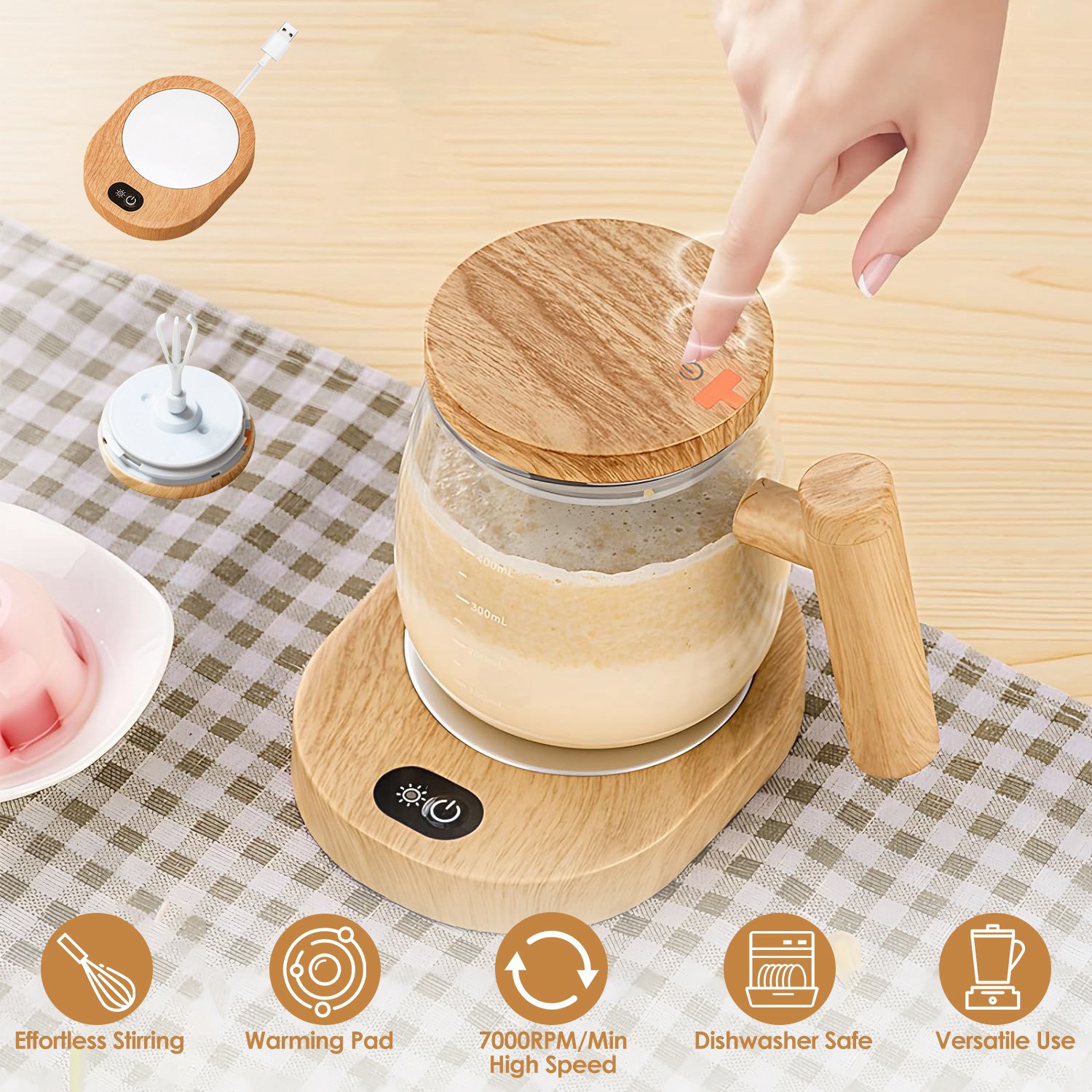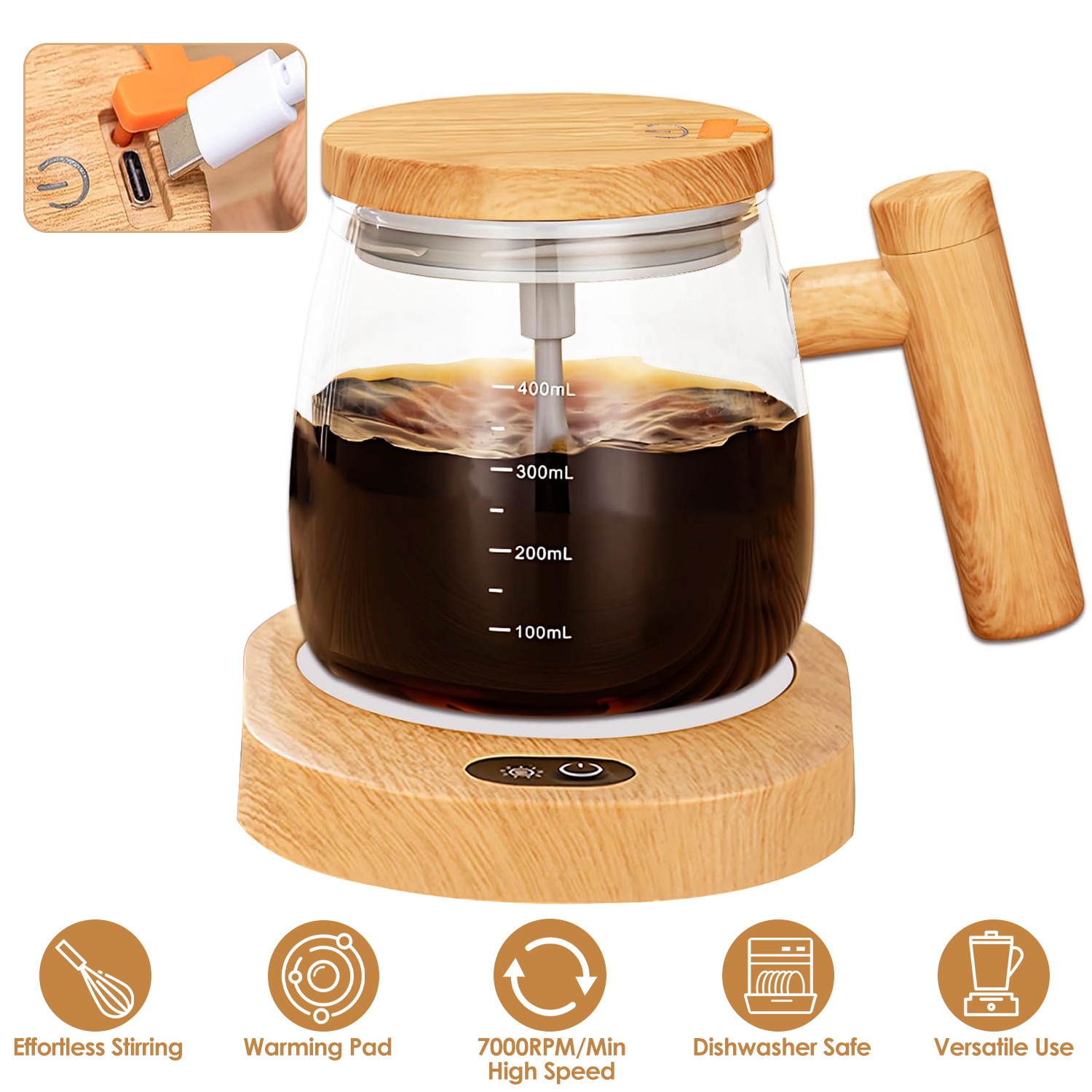 Are you tired of struggling to mix your morning coffee or oatmeal to perfection? Look no further than our self mixing mug! Featured with 7000rpm/min high speed, this electric mixing cup does all the stirring for you, such as stirring coffee, oatmeal, milk powder, black sesame paste, hot chocolate, protein powder, cocoa, juices, chia seeds, matcha etc.. Also suitable for whisking eggs. Come with a warming pad to keep the beverage at a desirable temperature, allowing for the enjoyment of warm drinks over an extended period. Made of high borosilicate glass, heat-resistant up to 302℉, dishwasher safe and healthy to use. Provide up to 90 minutes of continuous stirring after 1 hour’s charging, making it practical for everyday use. Don't settle for lumpy oatmeal or poorly mixed drinks. Upgrade to our self-stirring mug and experience the future of mixing!