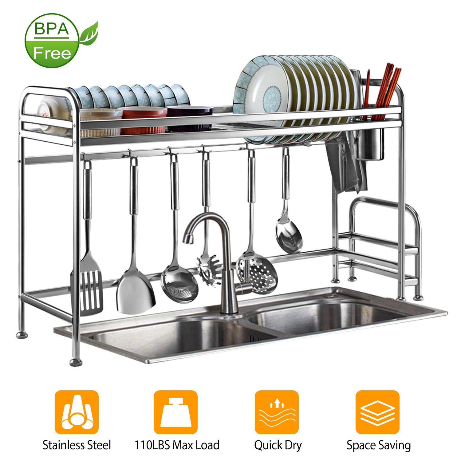 Over Sink Dish Drying Rack Shelf Stainless Steel Kitchen Countertop Bowl Dish Chopping Board Organizer Rack w/ Cutlery Holder