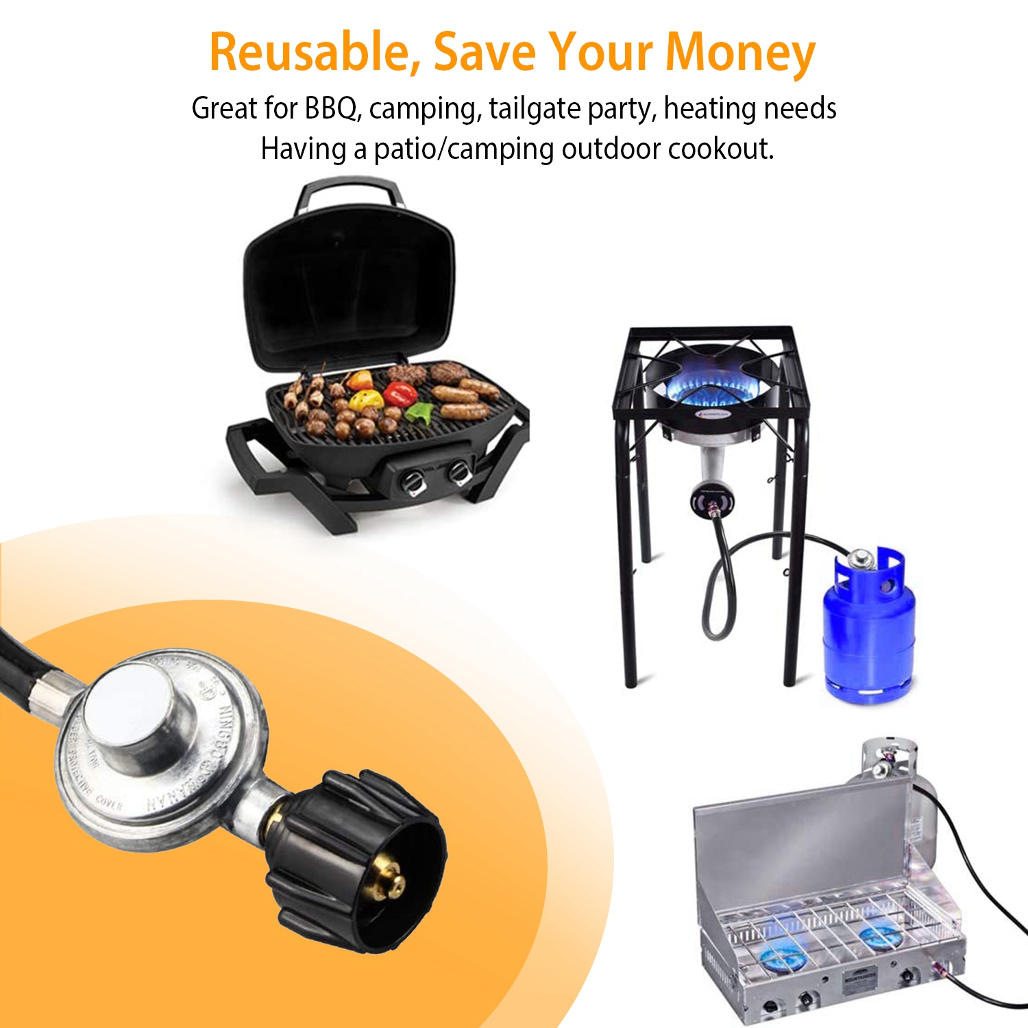 Low pressure propane regulator fits QCC1/Type1 LP gas propane tanks and 5/8-18UNF connection. Let you stop spending more money on those expensive 16.4oz /1lb little propane bottles. Passed CSA certified render you more safety. Durable brass and long-lasting hose provide a secure and sealed connection between grill and tank to ensure you safe leakage-free operation. No tools needed and great for BBQ, camping, tailgate party, heating needs or having a patio/camping outdoor cookout.