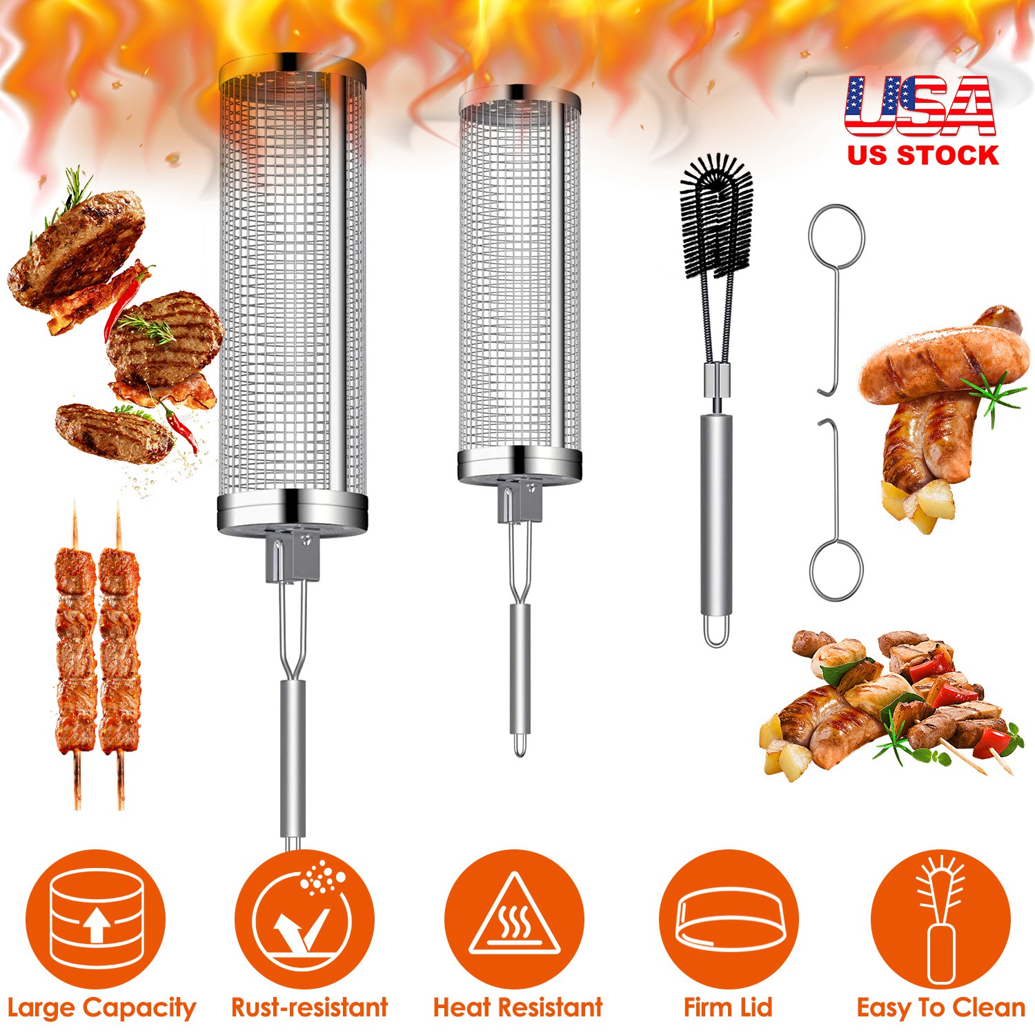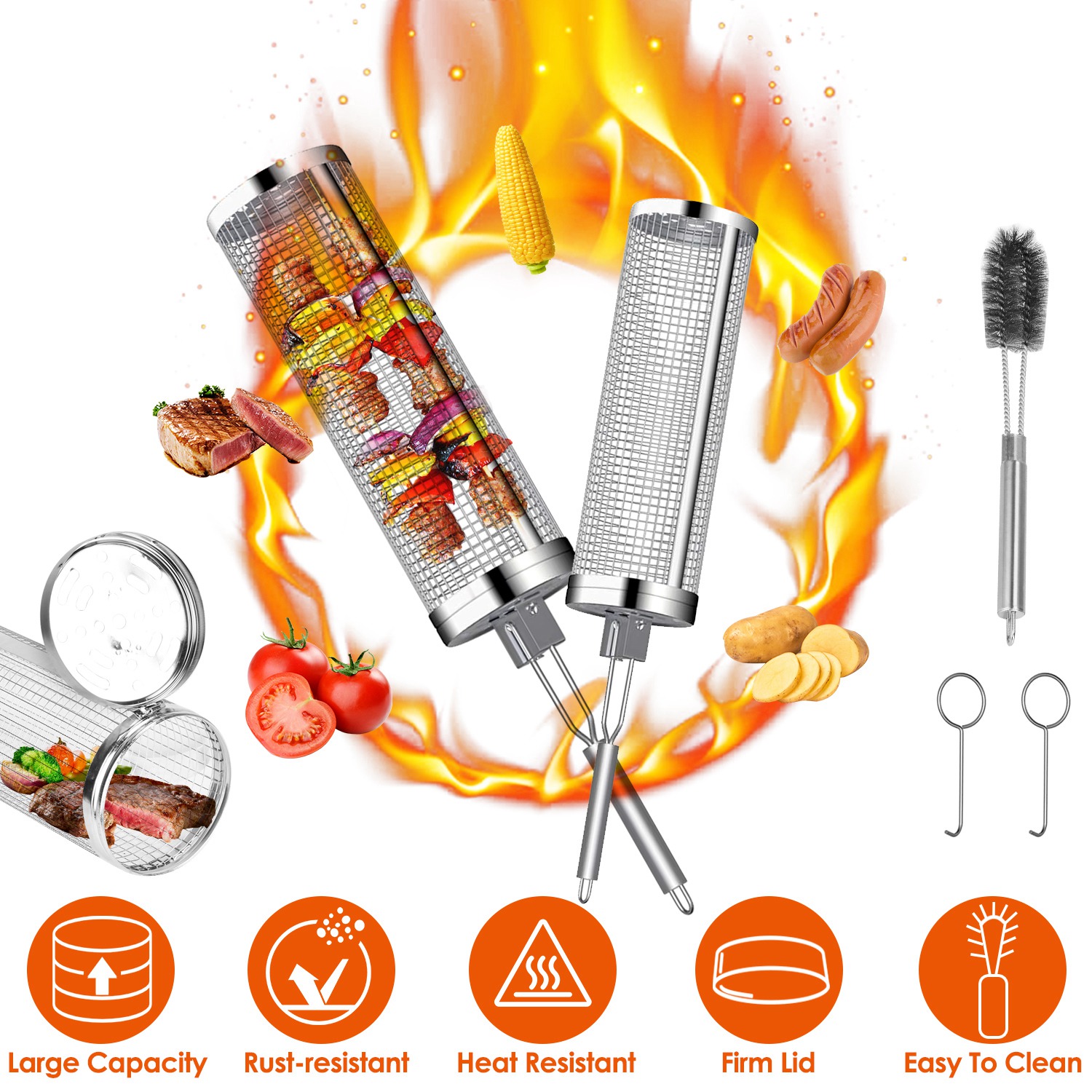 2Pack Rolling Grill Baskets BBQ Net Tubes Stainless Steel Barbecue Grill Grates with 2 Handles 2 Hooks Cleaning Brush for Vegetable Fish Meat Food Cam