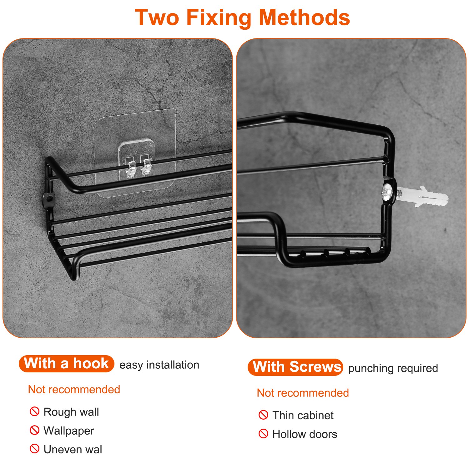 Our cabinet spice rack is designed to bring you an uncluttered and well organized kitchen. The hollowed-out design enables you to easily find out the target at one glance, time-saving and more convenient. Two ways install them on most surfaces. For traceless installation, use the hooks. For firm, use screws. Easy to keep discrete if desired or display for part of your decor, in any room or any place on wall as display shelf. Keep your accessories in a neat row with the 4Pcs wall-mounted space saving spice racks.
