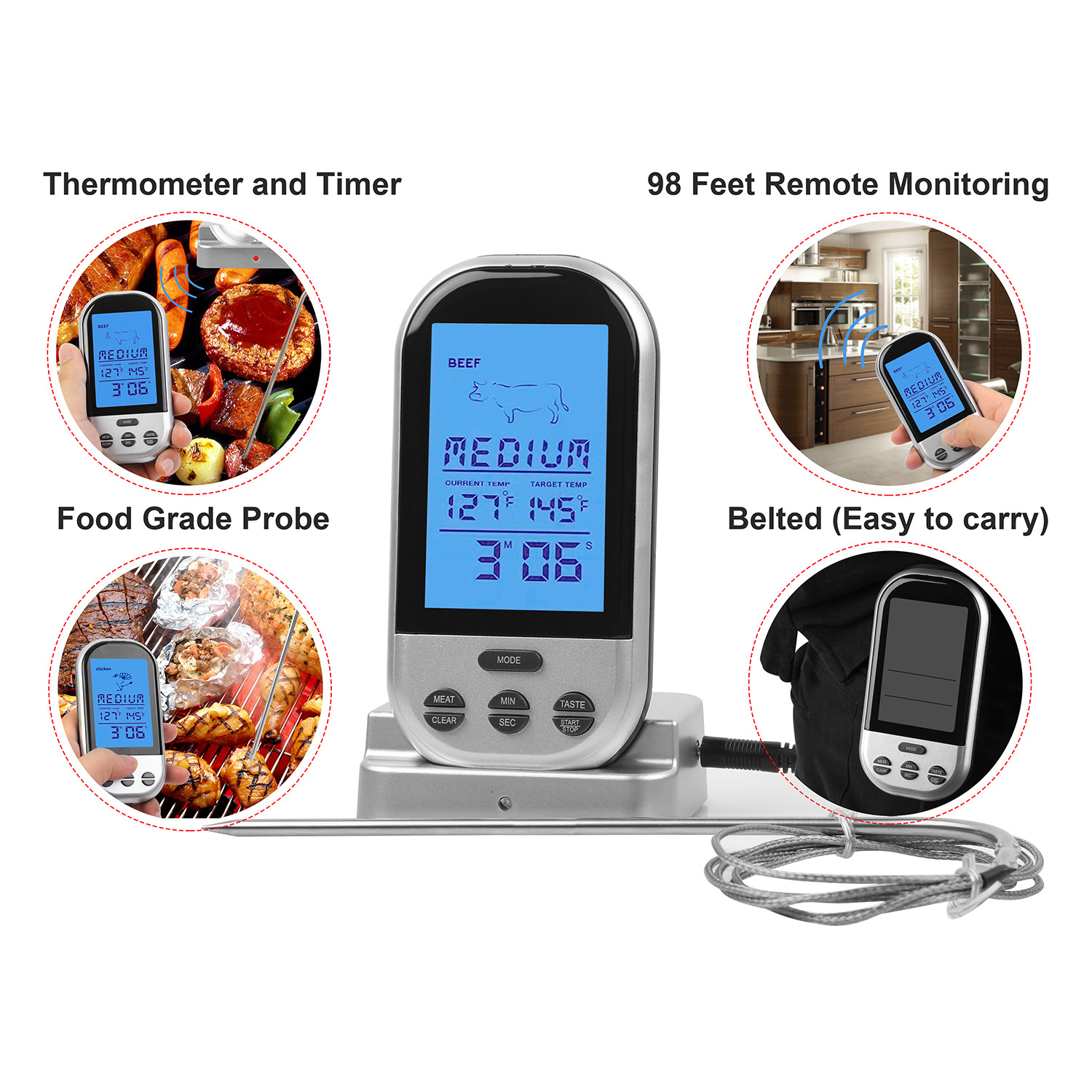 The digital meat thermometer includes a receiver with large backlit LCD and a transmitter with a stainless steel probe, which can offers a 98ft/30m wireless monitoring and operation. It supports test and monitors 8 type of meat and 5-level taste, you can free choose from the included meat type and level of tastes as your will without any worry, because the thermometer will alert you when the meat temperature reaches to pre-set parameter. Moreover, its timer function allows you to set up cooking time. It is a useful tool for BBQ, smoking meat or cook use.