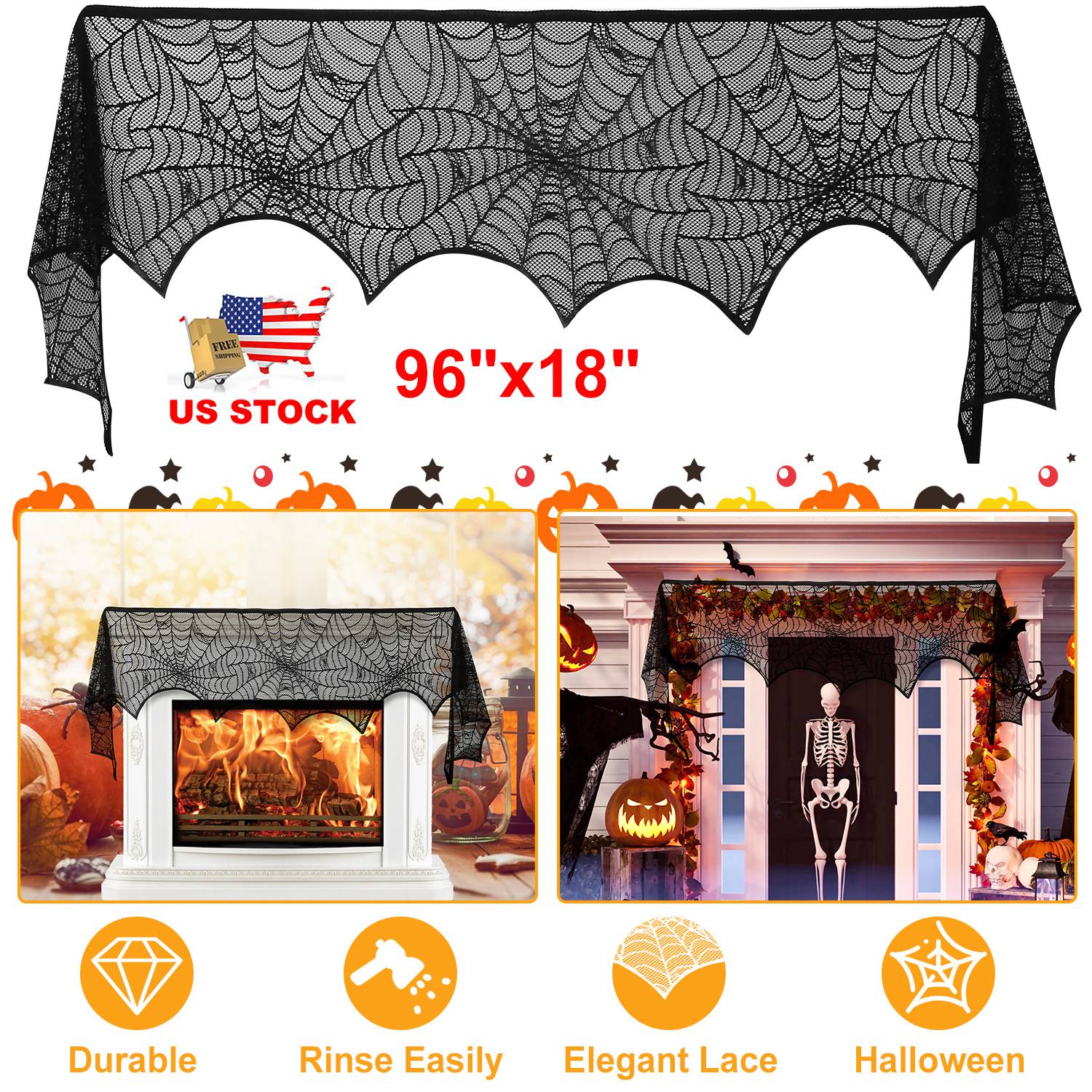 Are your ready for your Halloween decoration? iMounTEK Halloween fireplace scarf is paired with more Halloween party decor. Halloween elements, spiders, vampires, will together make up the Halloween decorations you want. Creating the perfect ambiance for your Halloween or other party with elegant spooky black lace decor accessories. Elegant spooky additions for haunted house, mansion and castle scenery or party decor. In addition, enjoy a unique Halloween decorations with the black lace spiderweb fireplace mantle. Time to decorate your fireplace, mantel, window, door, hutch, porch, and grab all Halloween fun.