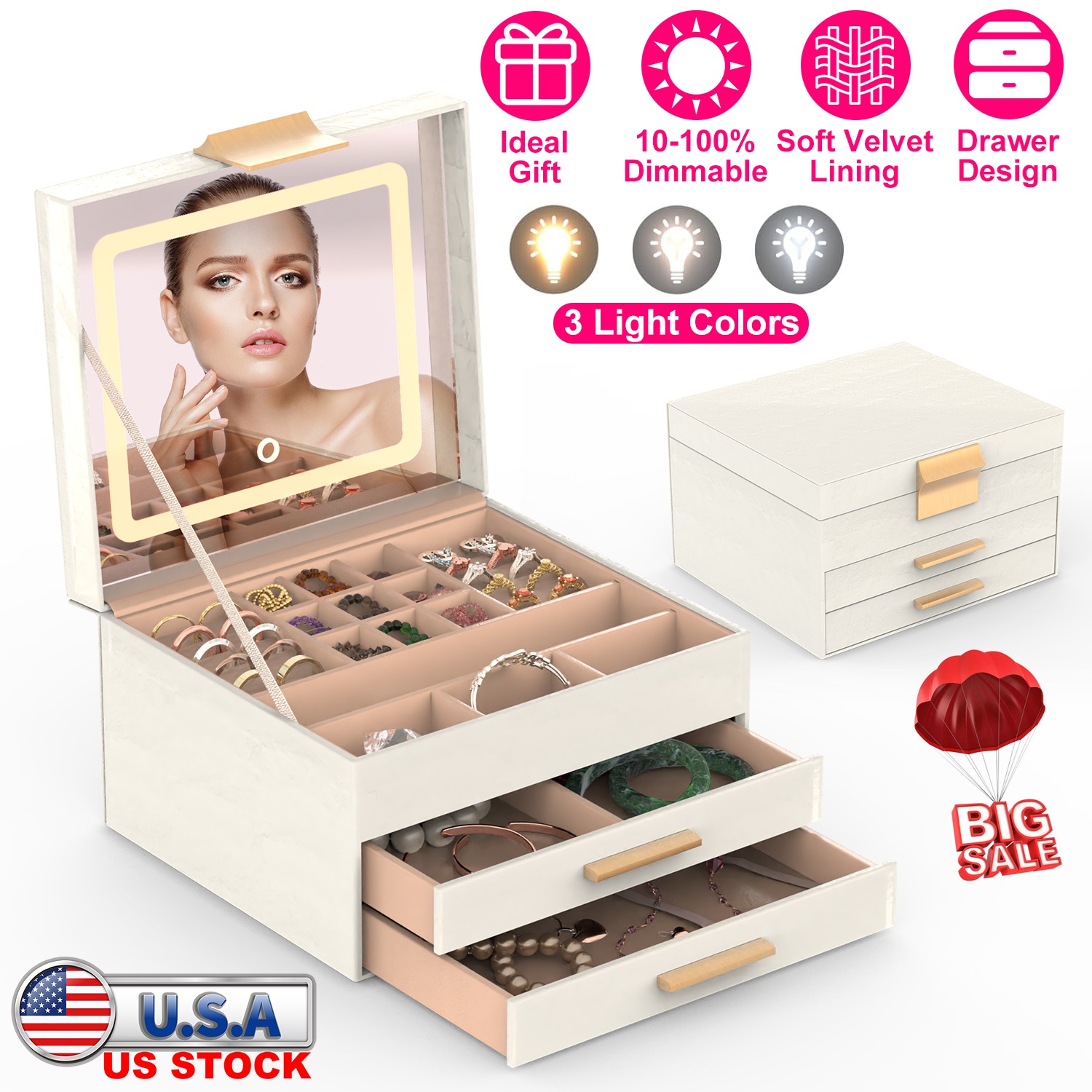 Home > Jewelry Box with LED Mirror 3-Layer Jewelry Organizer with 2 Drawers PU Jewelry Holder with 3 Mirror Light Colors Dimmable for Earrings Rings Bracelet