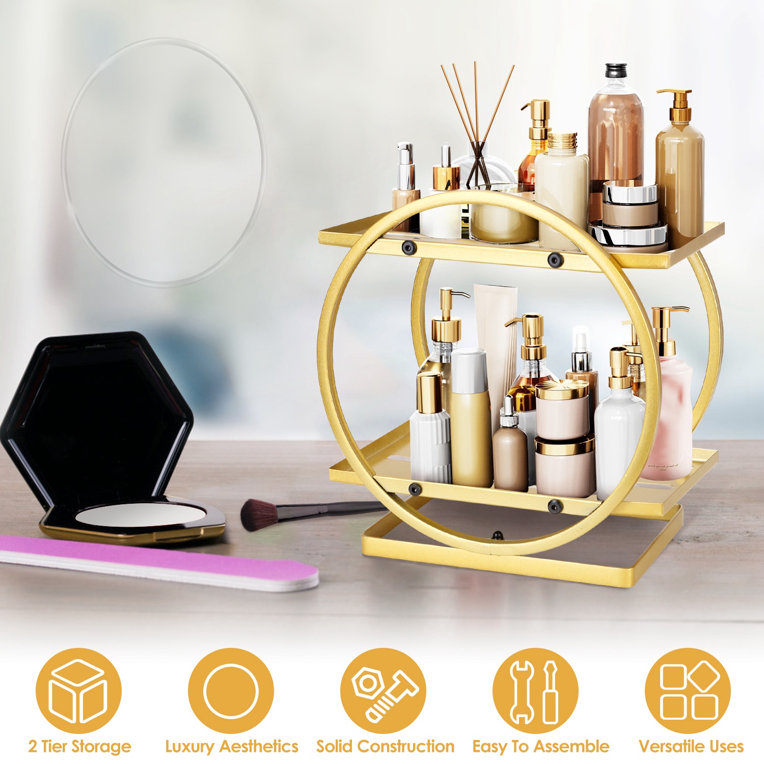 2 Tier Makeup Organizer for Vanity Gold Perfume Organizer for Dresser Carbon Steel Kitchen Bathroom Countertop Organizer Cosmetic Display Trays Servin